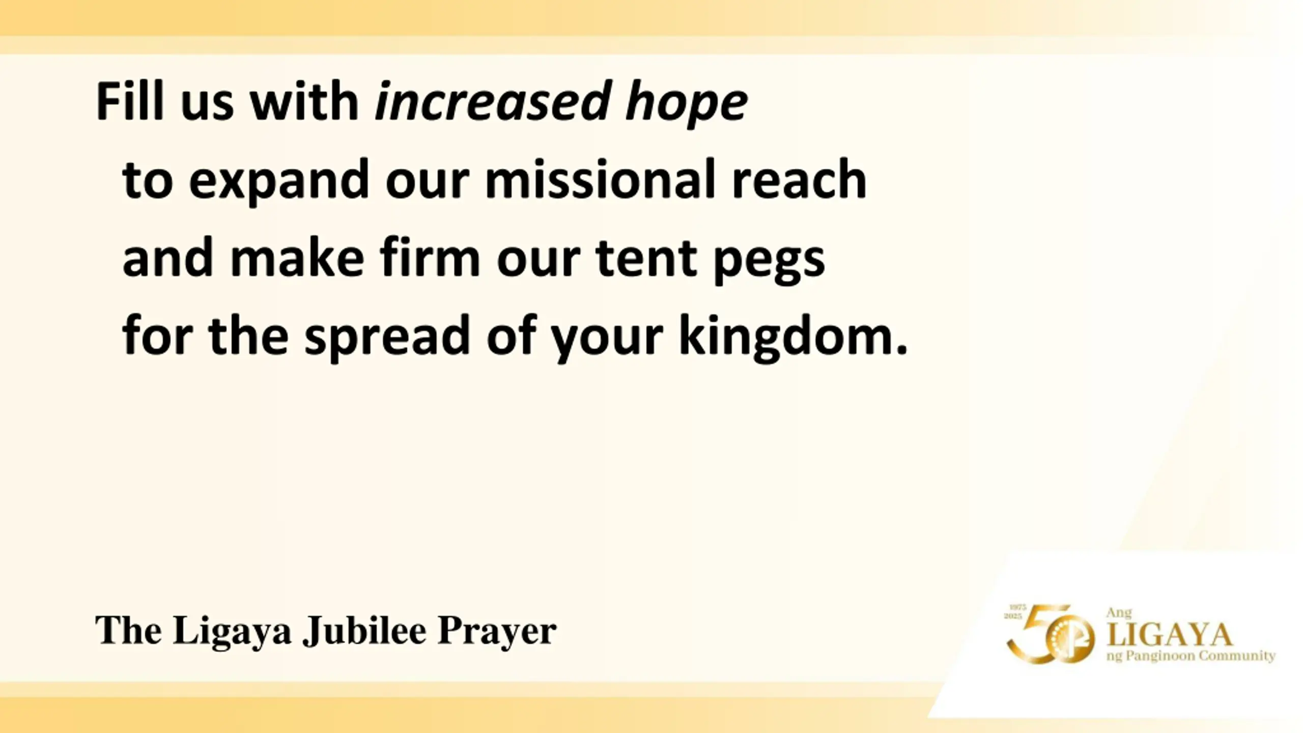 Fill us with increased hope to expand our missional reach and make firm our tent pegs for the spread of your kingdom. The Ligaya Jubilee Prayer