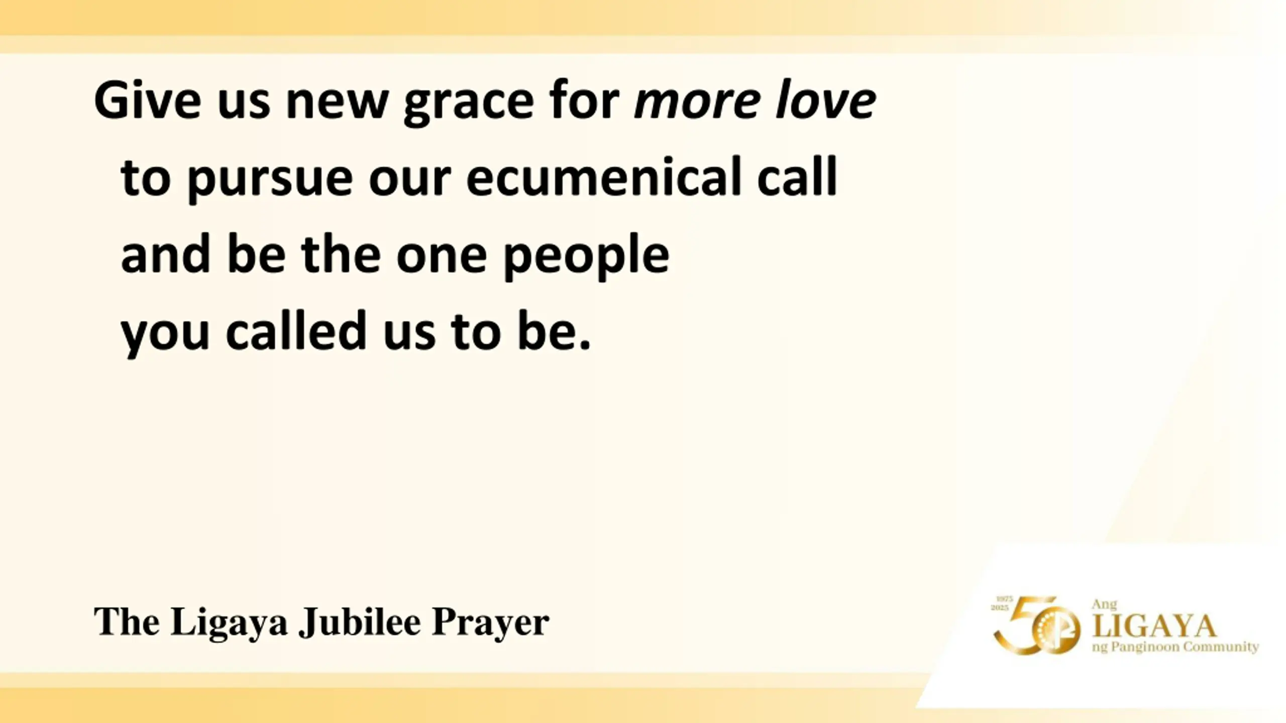 Give us new grace for more love to pursue our ecumenical call and be the one people you called us to be. The Ligaya Jubilee Prayer