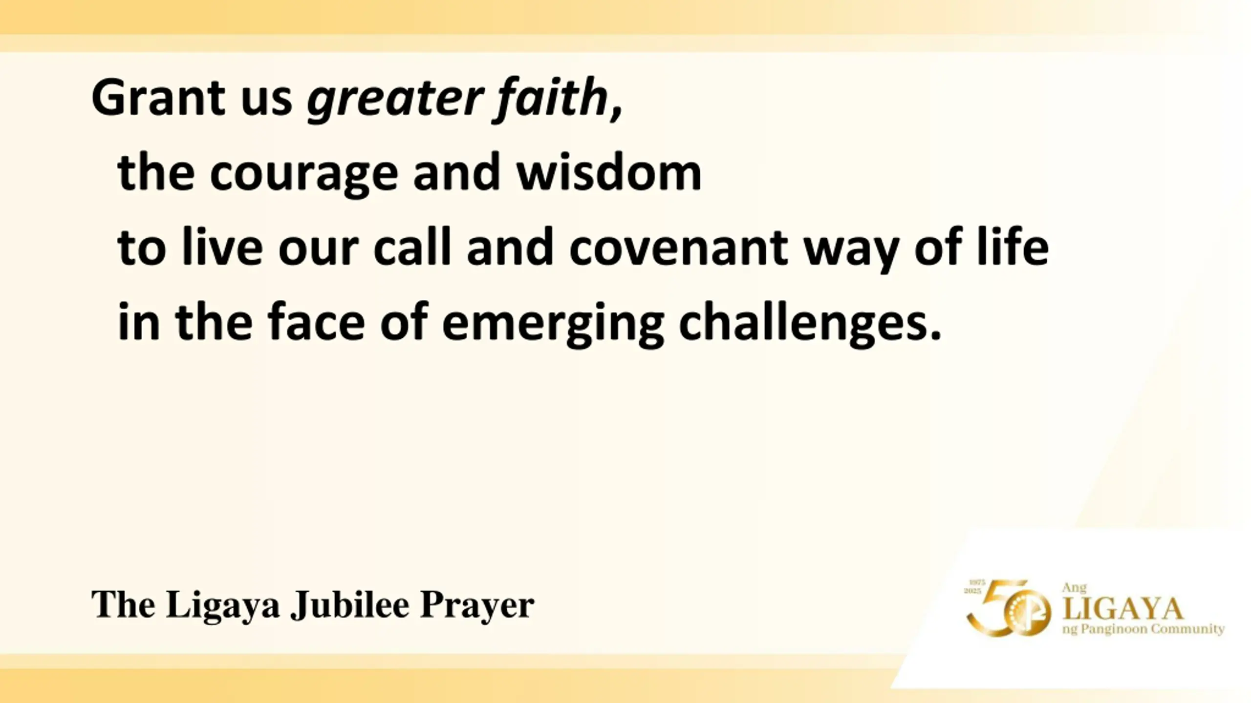 Grant us greater faith, the courage and wisdom to live our call and covenant way of life in the face of emerging challenges. The Ligaya Jubilee Prayer