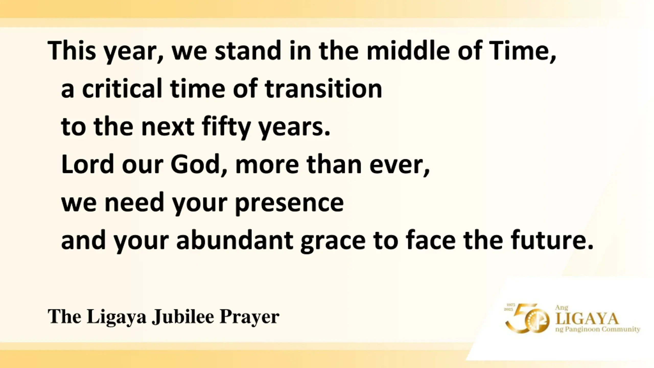 This year, we stand in the middle of Time, a critical time of transition to the next fifty years. Lord our God, more than ever, we need your presence and your abundant grace to face the future. The Ligaya Jubilee Prayer