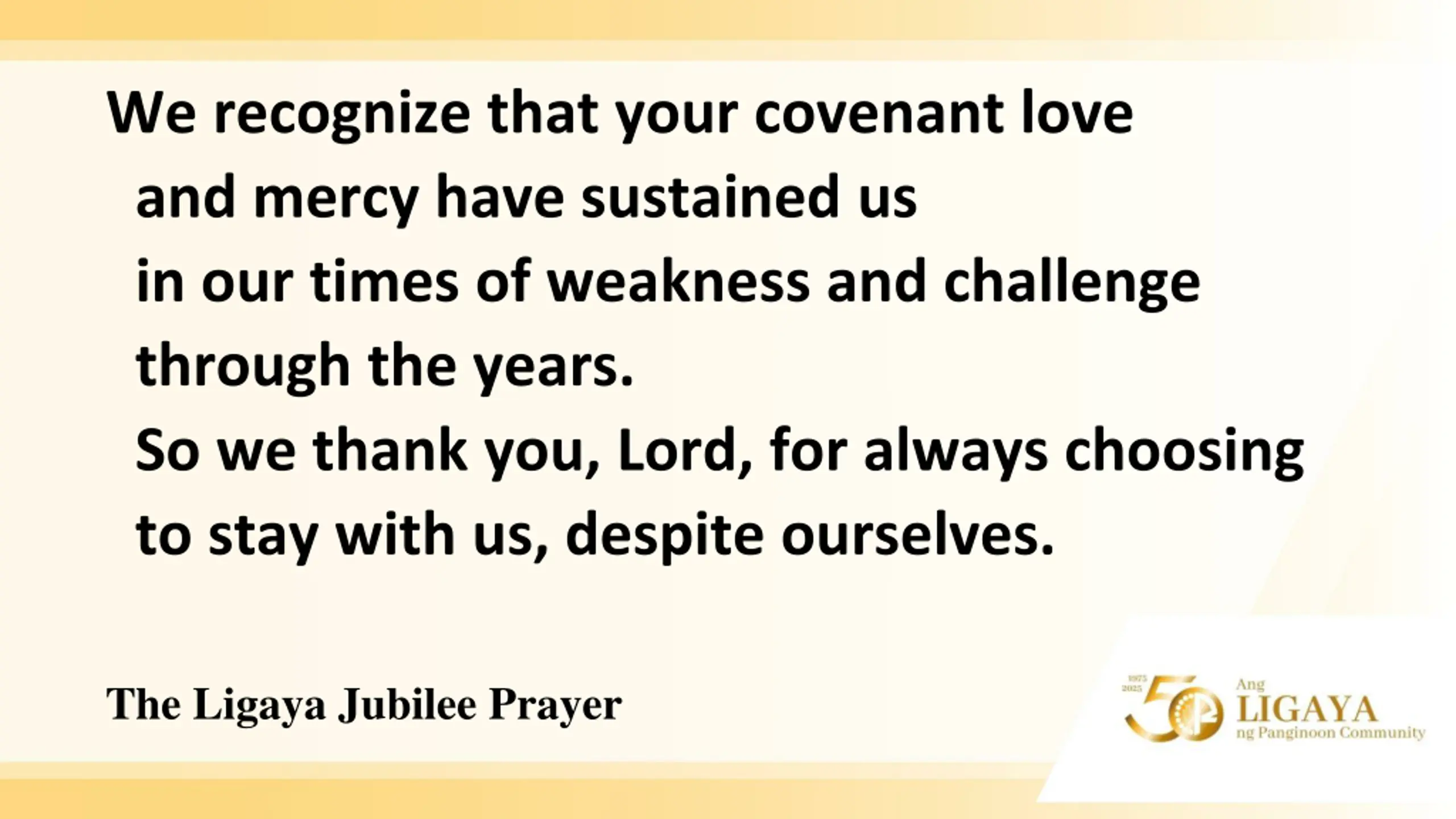 We recognize that your covenant love and mercy have sustained us in our times of weakness and challenge through the years. So we thank you, Lord, for always choosing to stay with us, despite ourselves. The Ligaya Jubilee Prayer