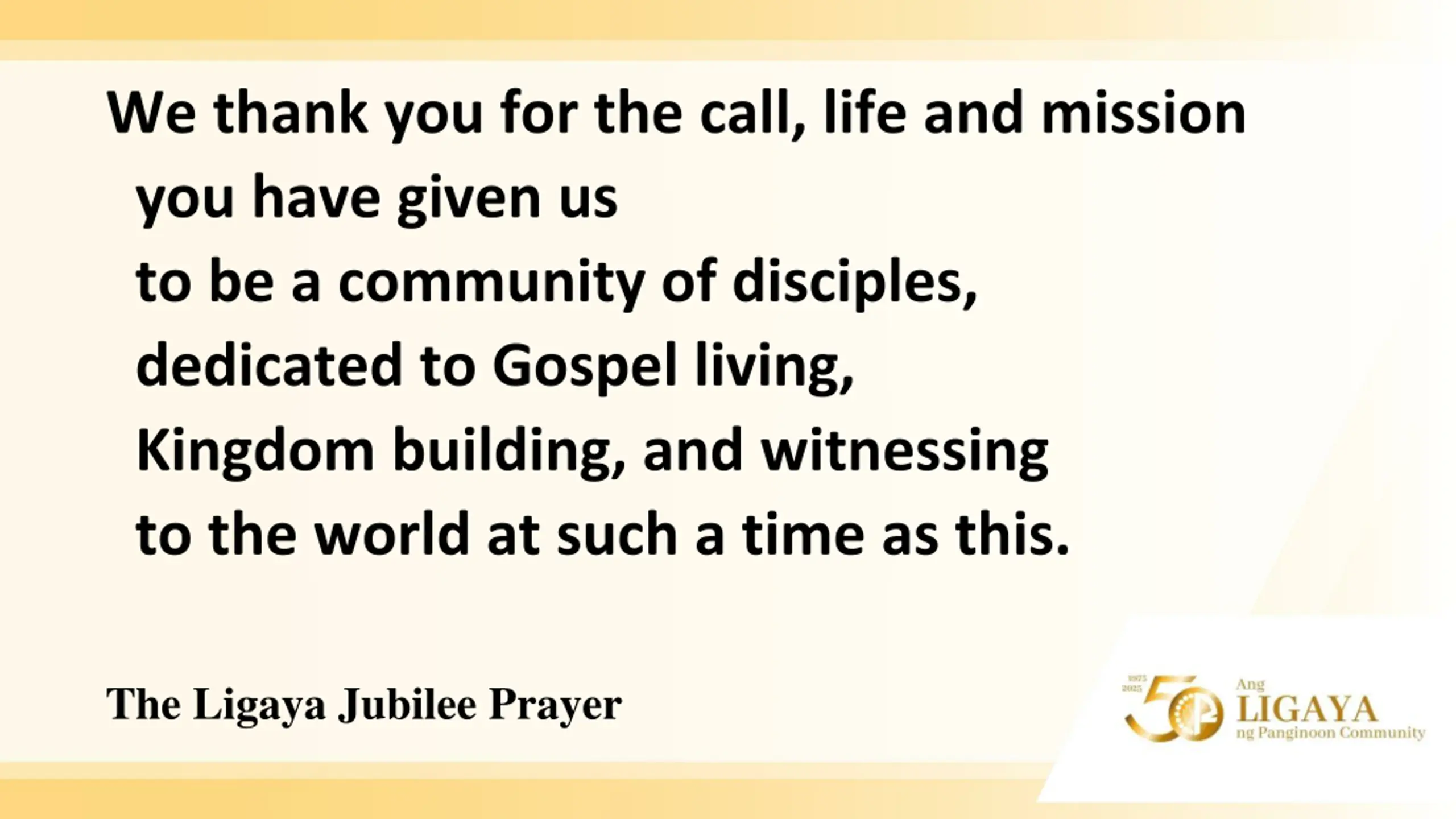 We thank you for the call, life and mission you have given us to be a community of disciples, dedicated to Gospel living, Kingdom building, and witnessing to the world at such a time as this. The Ligaya Jubilee Prayer