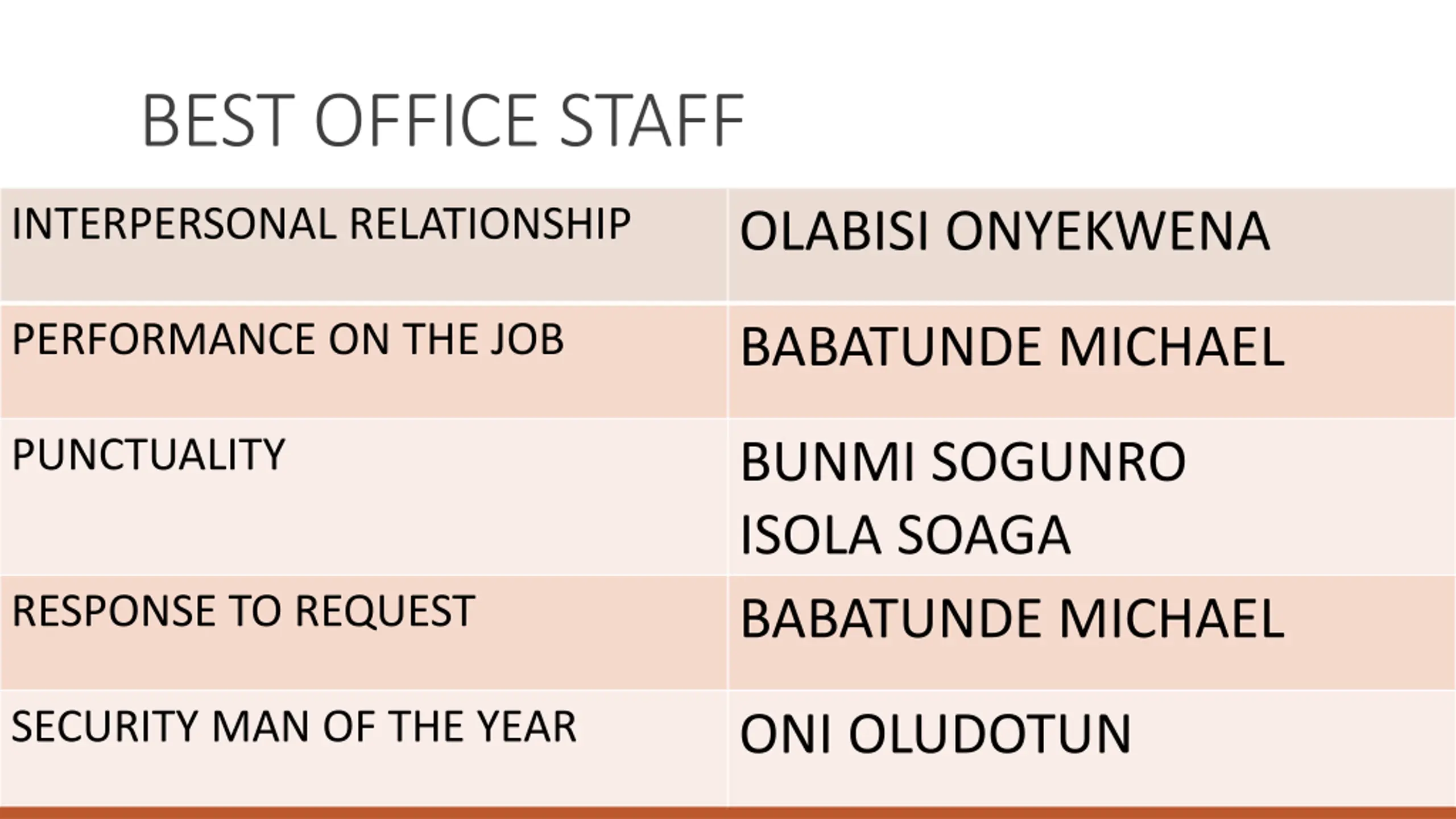 BEST OFFICE STAFF INTERPERSONAL RELATIONSHIP OLABISI ONYEKWENA PERFORMANCE ON THE JOB BABATUNDE MICHAEL PUNCTUALITY BUNMI SOGUNRO ISOLA SOAGA BABATUNDE MICHAEL RESPONSE TO REQUEST SECURITY MAN OF THE YEAR ONI OLUDOTUN