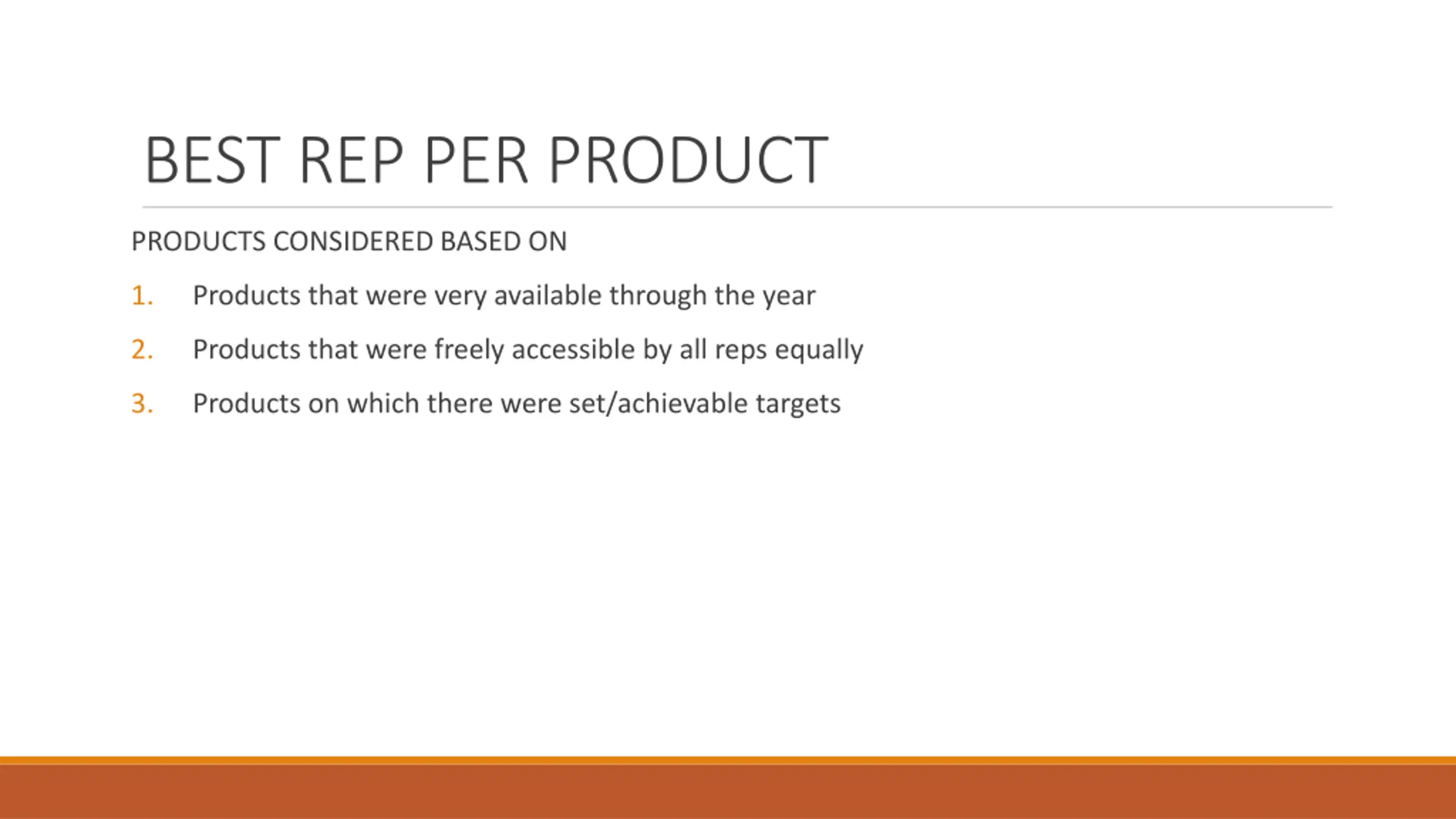 BEST REP PER PRODUCT PRODUCTS CONSIDERED BASED ON 1. Products that were very available through the year 2. Products that were freely accessible by all reps equally 3. Products on which there were set/achievable targets