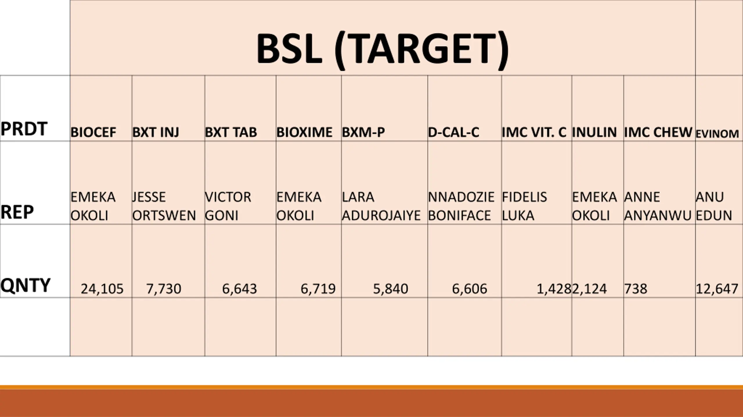 BSL (TARGET) PRDT BIOCEF BXT INJ BXT TAB BIOXIME BXM-P D-CAL-C IMC VIT. C INULIN IMC CHEW EVINOM EMEKA OKOLI JESSE ORTSWEN VICTOR GONI EMEKA OKOLI LARA ADUROJAIYE NNADOZIE BONIFACE FIDELIS LUKA EMEKA OKOLI ANNE ANYANWU ANU EDUN REP QNTY 24,105 7,730 6,643 6,719 5,840 6,606 1,428 2,124 738 12,647