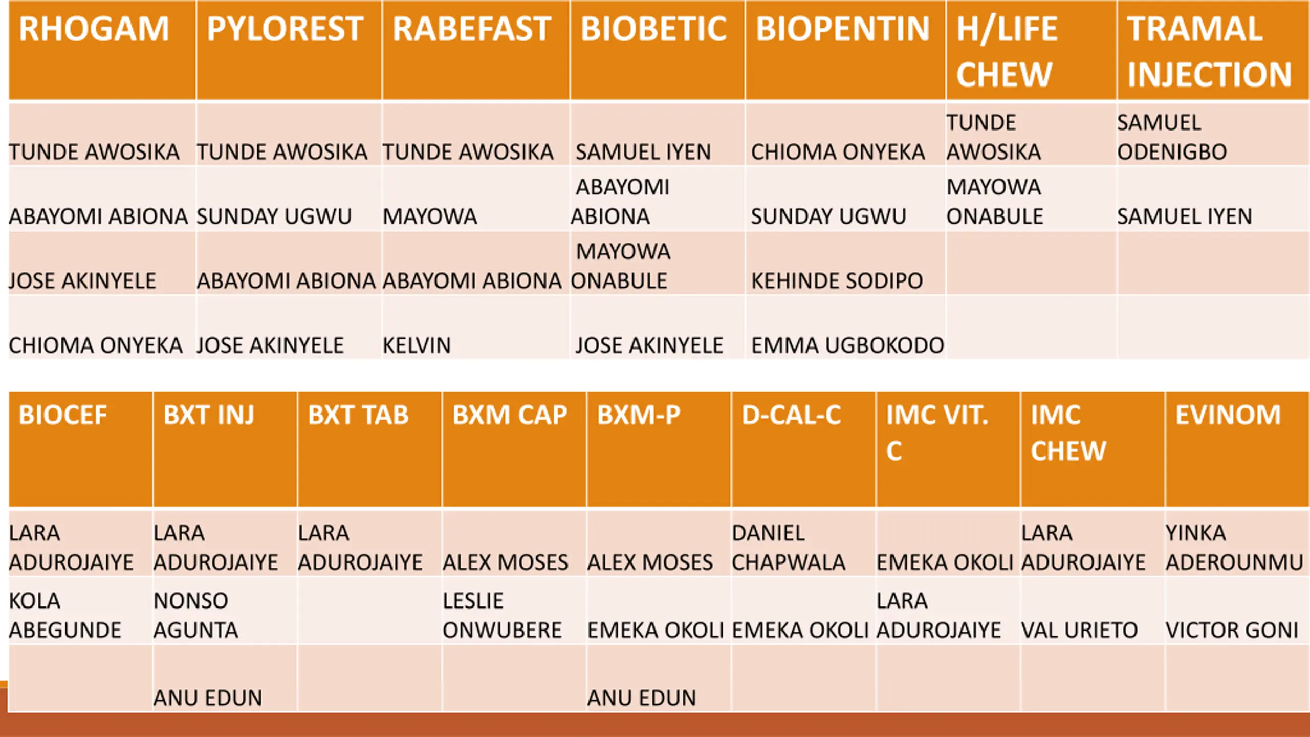RHOGAM PYLOREST RABEFAST BIOBETIC BIOPENTIN H/LIFE TRAMAL INJECTION CHEW TUNDE AWOSIKA MAYOWA ONABULE SAMUEL ODENIGBO TUNDE AWOSIKA TUNDE AWOSIKA TUNDE AWOSIKA SAMUEL IYEN CHIOMA ONYEKA ABAYOMI ABIONA MAYOWA ONABULE ABAYOMI ABIONA SUNDAY UGWU MAYOWA SUNDAY UGWU SAMUEL IYEN JOSE AKINYELE ABAYOMI ABIONA ABAYOMI ABIONA KEHINDE SODIPO CHIOMA ONYEKA JOSE AKINYELE KELVIN JOSE AKINYELE EMMA UGBOKODO BIOCEF BXT INJ BXT TAB BXM CAP BXM-P D-CAL-C IMC VIT. C IMC CHEW EVINOM LARA ADUROJAIYE LARA ADUROJAIYE LARA ADUROJAIYE ALEX MOSES ALEX MOSES DANIEL CHAPWALA LARA ADUROJAIYE YINKA ADEROUNMU EMEKA OKOLI KOLA ABEGUNDE NONSO AGUNTA LESLIE ONWUBERE LARA ADUROJAIYE VAL URIETO EMEKA OKOLI EMEKA OKOLI VICTOR GONI ANU EDUN ANU EDUN
