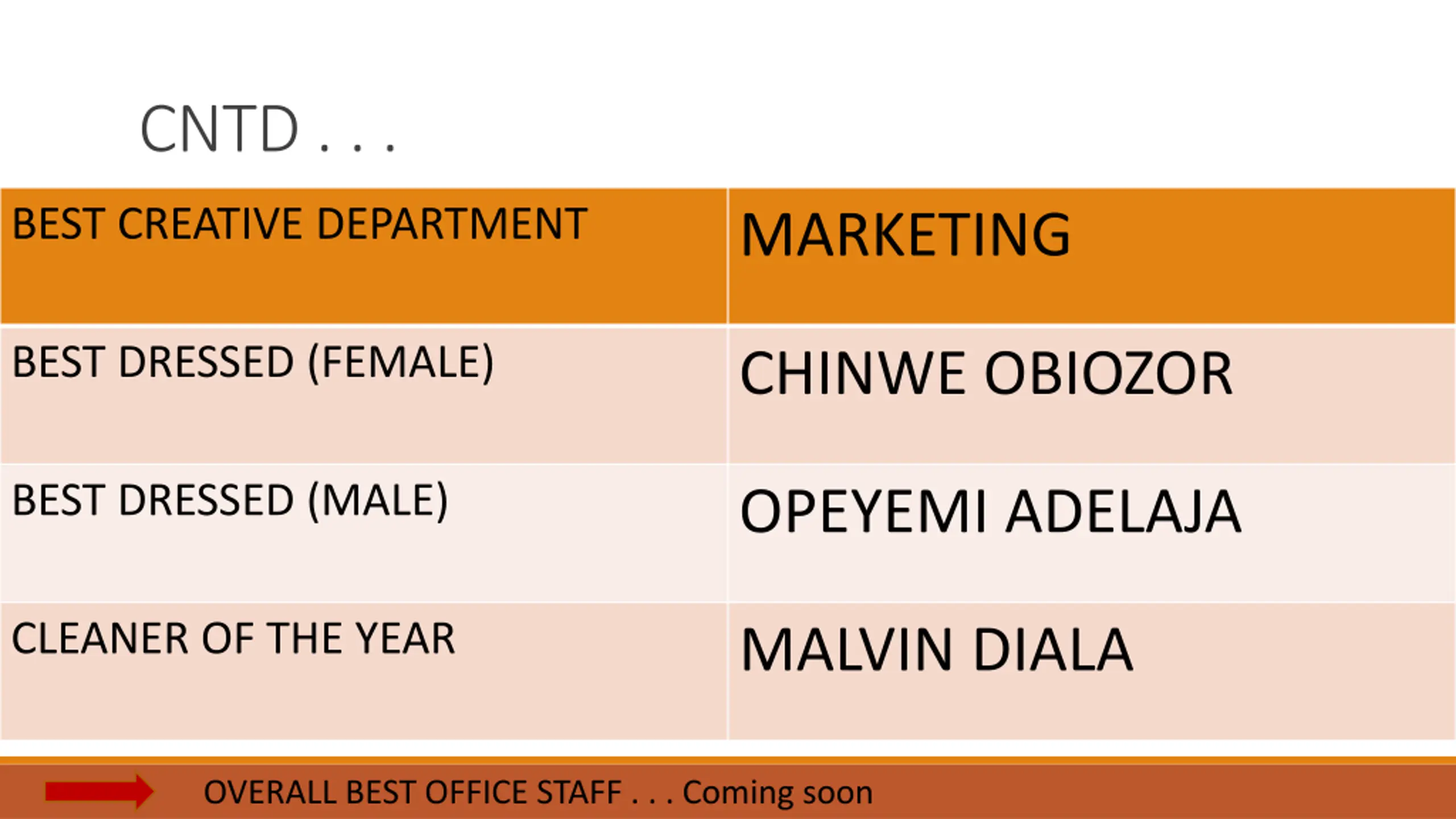 CNTD . . . BEST CREATIVE DEPARTMENT MARKETING BEST DRESSED (FEMALE) CHINWE OBIOZOR BEST DRESSED (MALE) OPEYEMI ADELAJA CLEANER OF THE YEAR MALVIN DIALA OVERALL BEST OFFICE STAFF . . . Coming soon