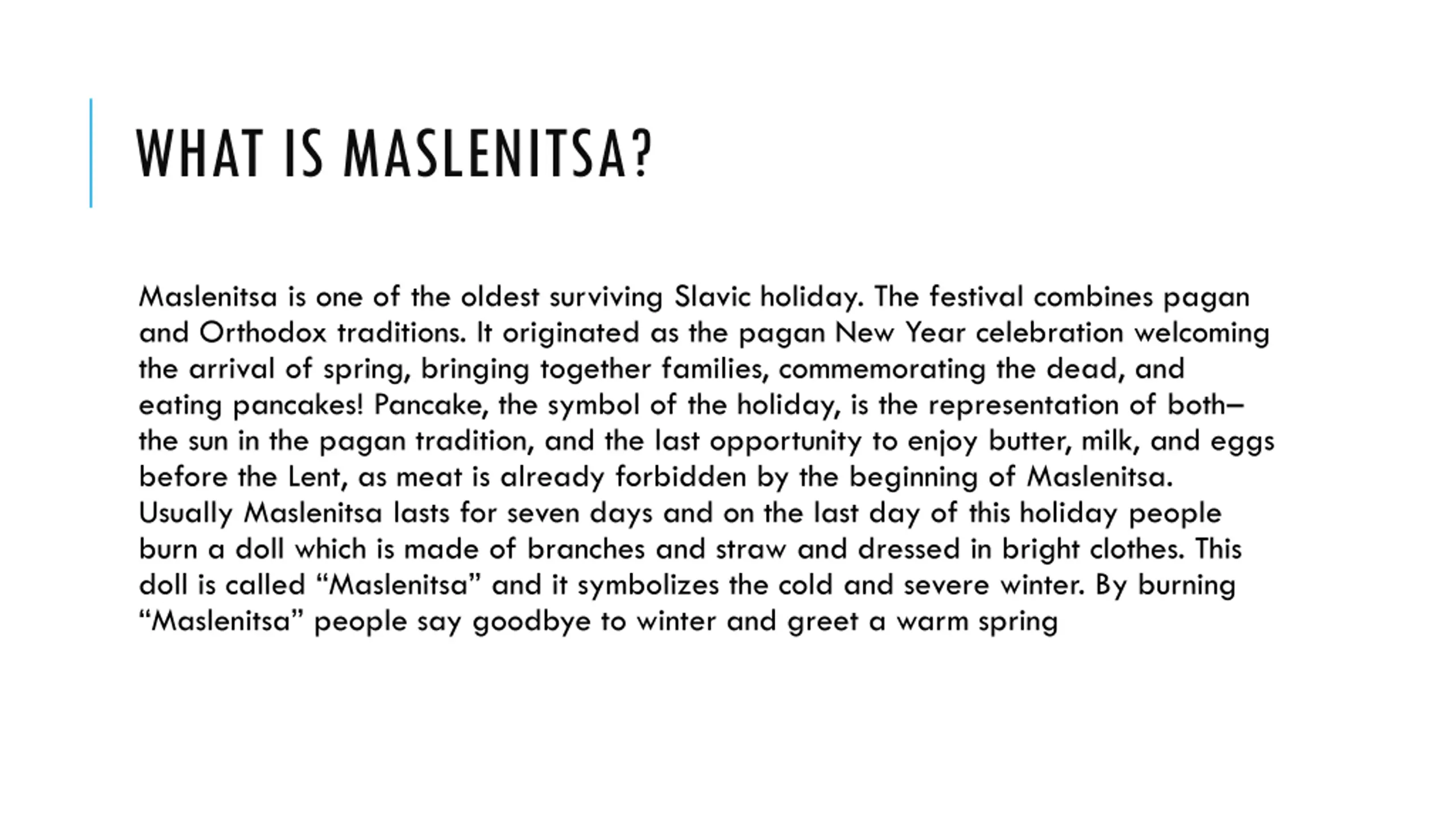WHAT IS MASLENITSA? Maslenitsa is one of the oldest surviving Slavic holiday. The festival combines pagan and Orthodox traditions. It originated as the pagan New Year celebration welcoming the arrival of spring, bringing together families, commemorating the dead, and eating pancakes! Pancake, the symbol of the holiday, is the representation of both the sun in the pagan tradition, and the last opportunity to enjoy butter, milk, and eggs before the Lent, as meat is already forbidden by the beginning of Maslenitsa. Usually Maslenitsa lasts for seven days and on the last day of this holiday people burn a doll which is made of branches and straw and dressed in bright clothes. This doll is called Maslenitsa and it symbolizes the cold and severe winter. By burning Maslenitsa people say goodbye to winter and greet a warm spring