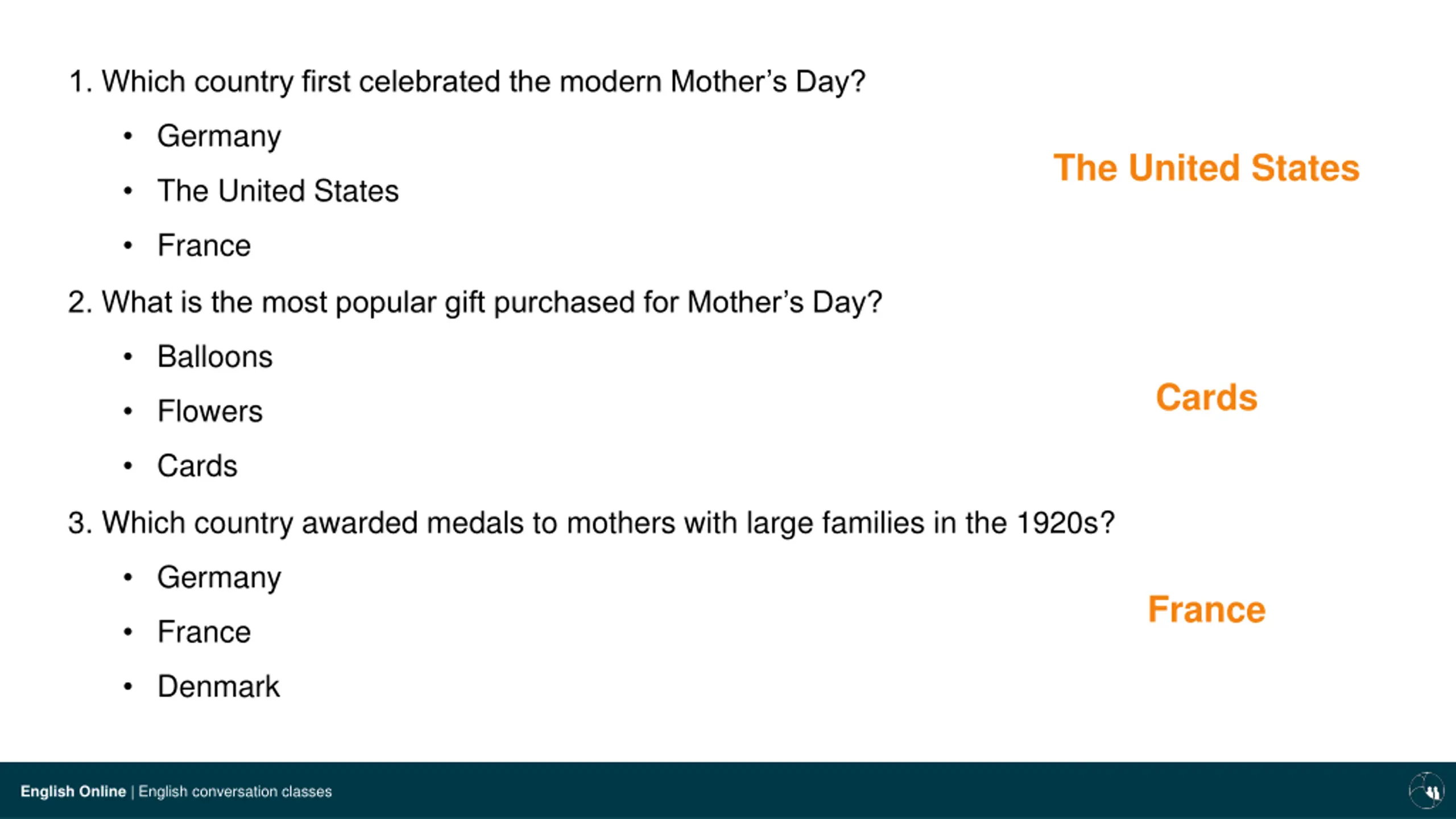 1. Which country first celebrated the modern Mothers Day? Germany The United States The United States France 2. What is the most popular gift purchased for Mother s Day? Balloons Cards Flowers Cards 3. Which country awarded medals to mothers with large families in the 1920s? Germany France France Denmark English Online | English conversation classes
