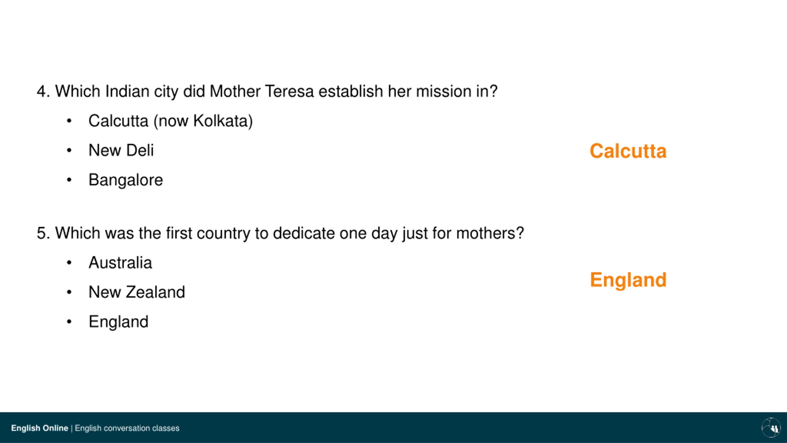 4. Which Indian city did Mother Teresa establish her mission in? Calcutta (now Kolkata) Calcutta New Deli Bangalore 5. Which was the first country to dedicate one day just for mothers? Australia England New Zealand England English Online | English conversation classes