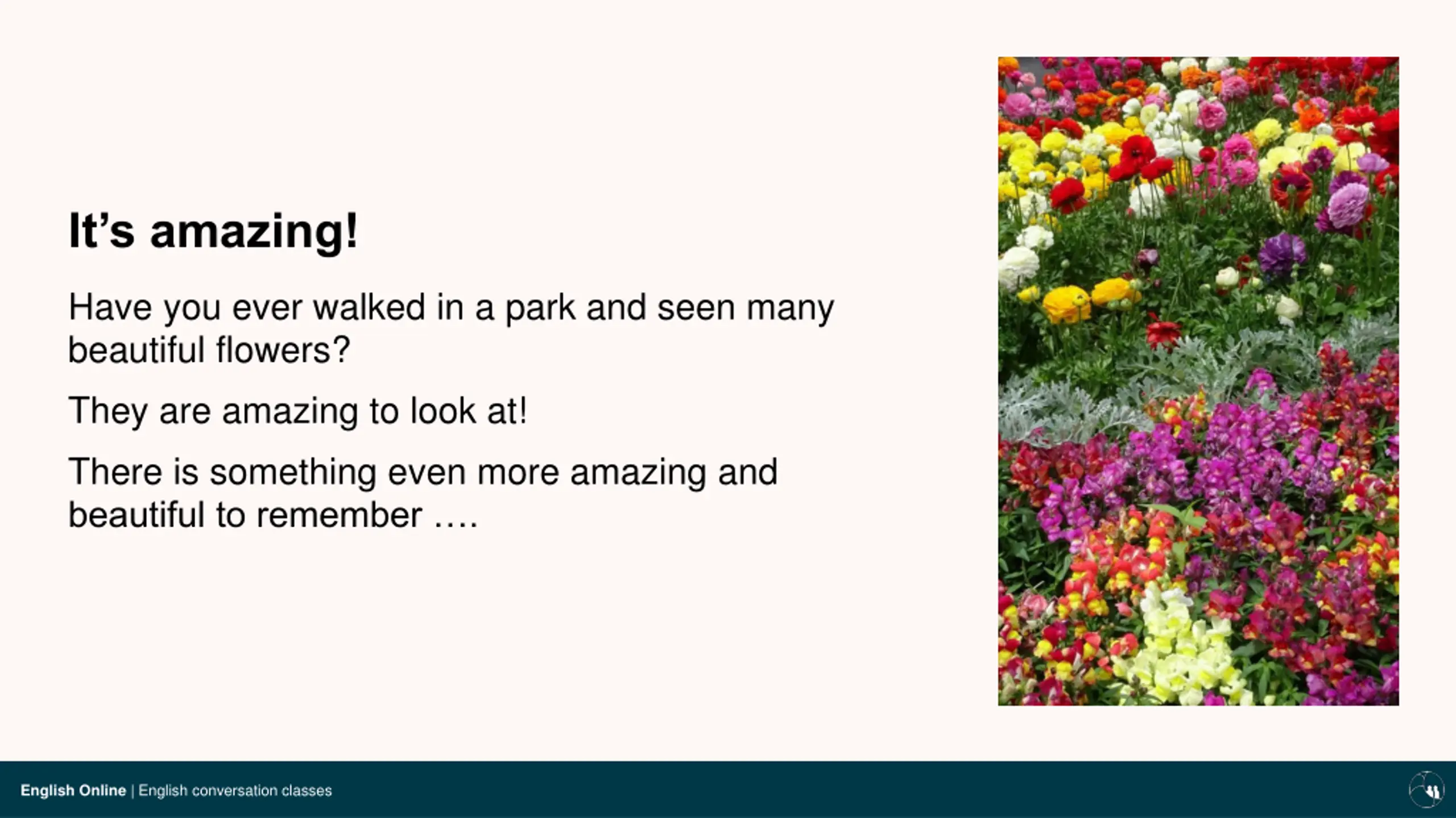 Its amazing! Have you ever walked in a park and seen many beautiful flowers? They are amazing to look at! There is something even more amazing and beautiful to remember . English Online | English conversation classes