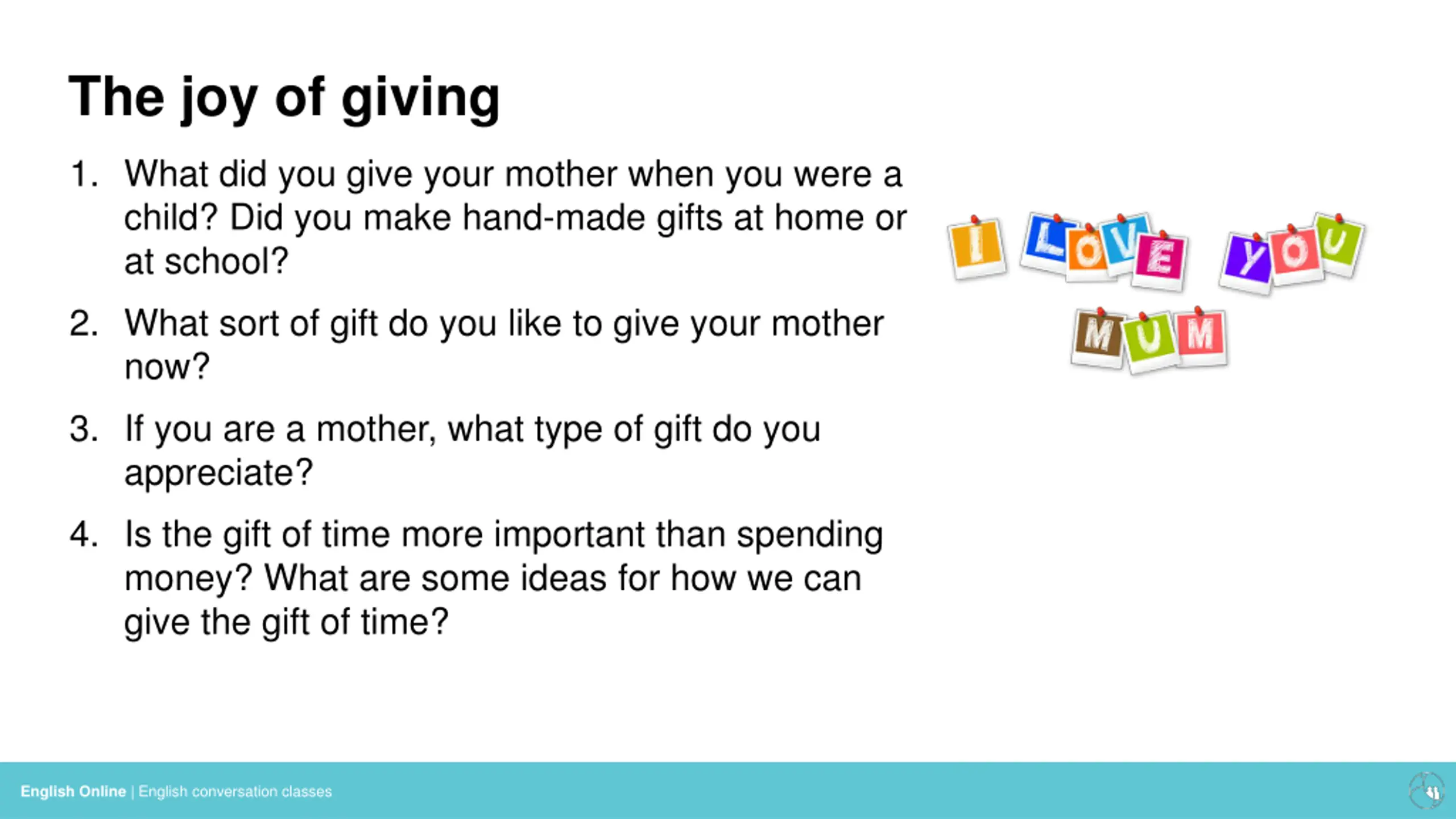 The joy of giving 1. What did you give your mother when you were a child? Did you make hand-made gifts at home or at school? 2. What sort of gift do you like to give your mother now? 3. If you are a mother, what type of gift do you appreciate? 4. Is the gift of time more important than spending money? What are some ideas for how we can give the gift of time? English Online | English conversation classes