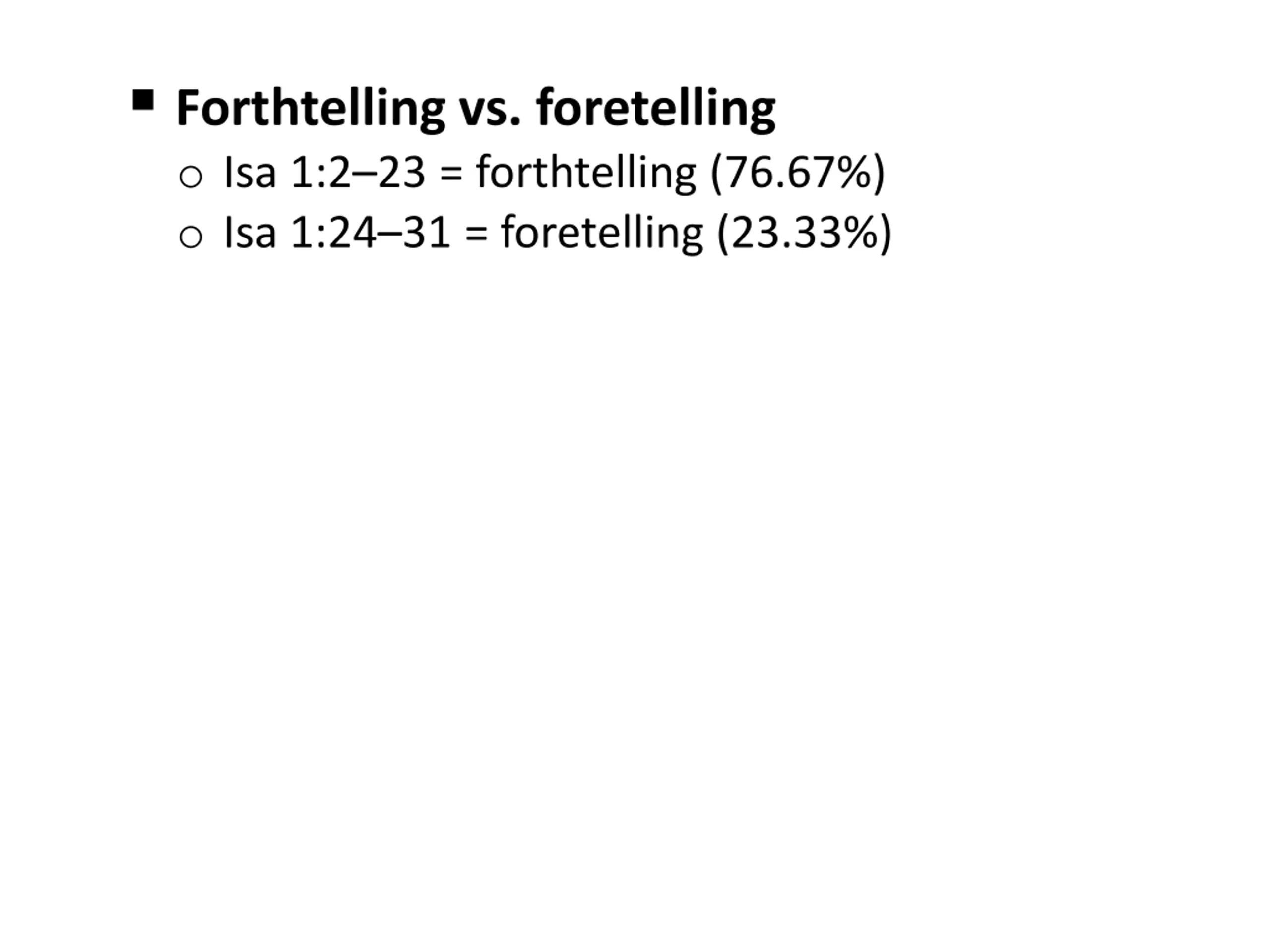 Forthtelling vs. foretelling o Isa 1:2 23 = forthtelling (76.67%) o Isa 1:24 31 = foretelling (23.33%)