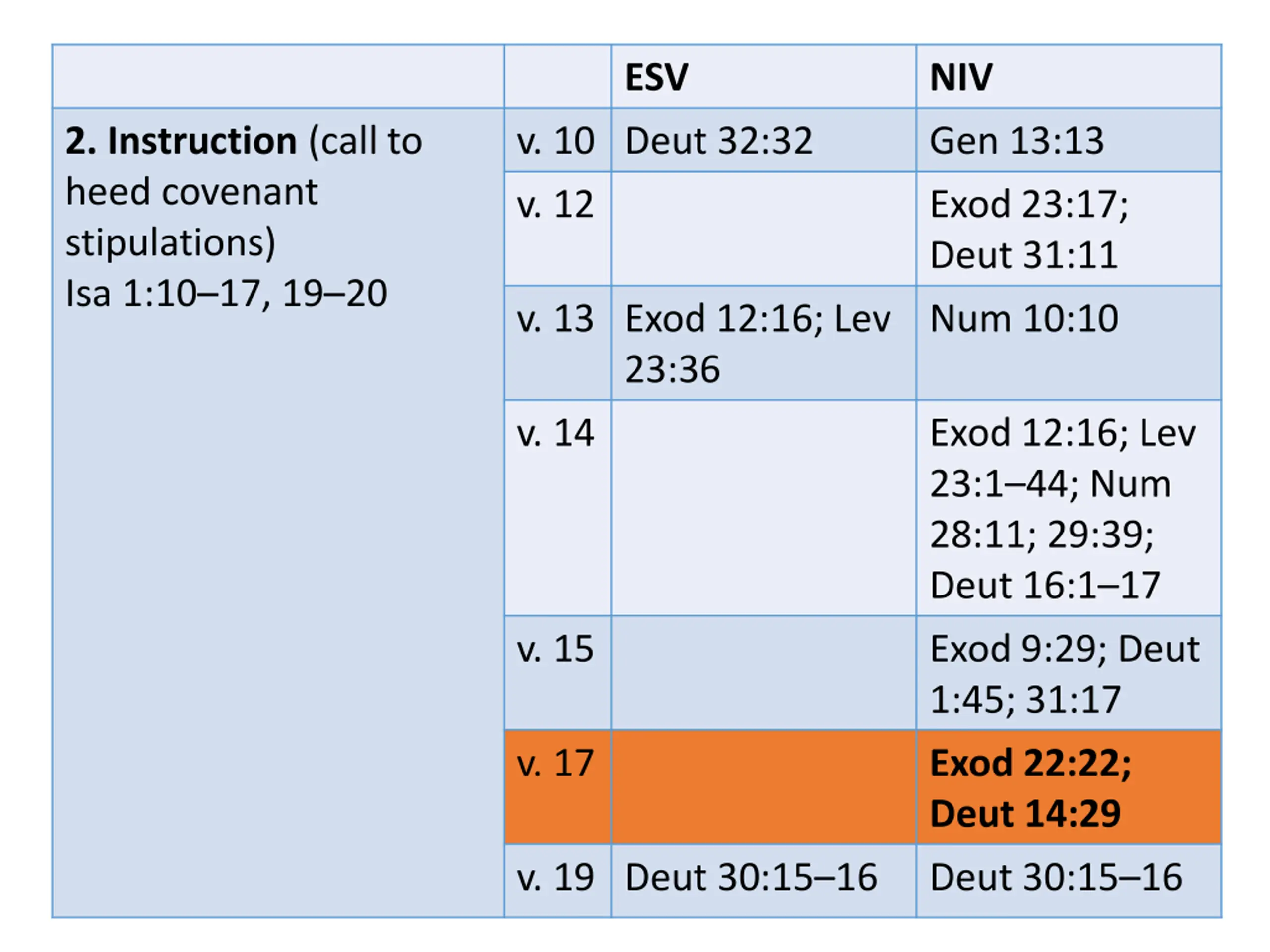 ESV NIV 2. Instruction (call to heed covenant stipulations) Isa 1:10 17, 19 20 v. 10 Deut 32:32 Gen 13:13 v. 12 Exod 23:17; Deut 31:11 v. 13 Exod 12:16; Lev 23:36 Num 10:10 v. 14 Exod 12:16; Lev 23:1 44; Num 28:11; 29:39; Deut 16:1 17 v. 15 Exod 9:29; Deut 1:45; 31:17 v. 17 Exod 22:22; Deut 14:29 v. 19 Deut 30:15 16 Deut 30:15 16