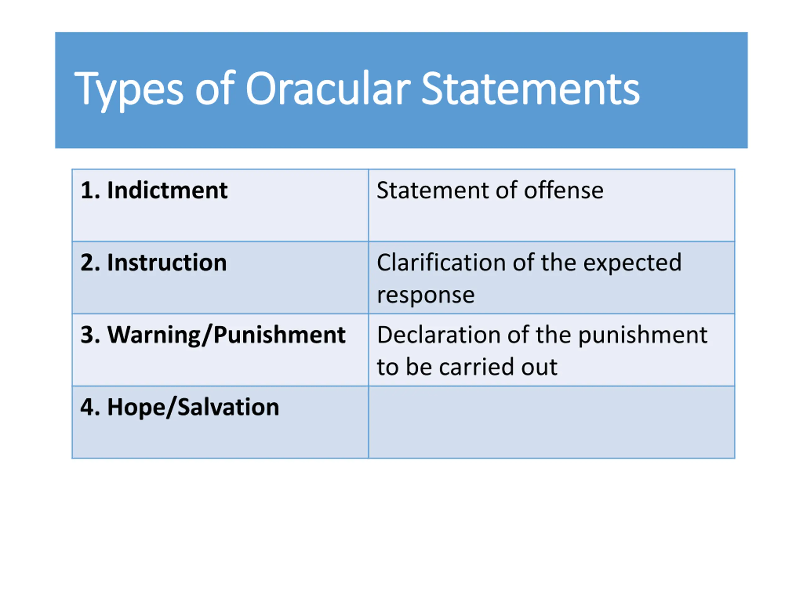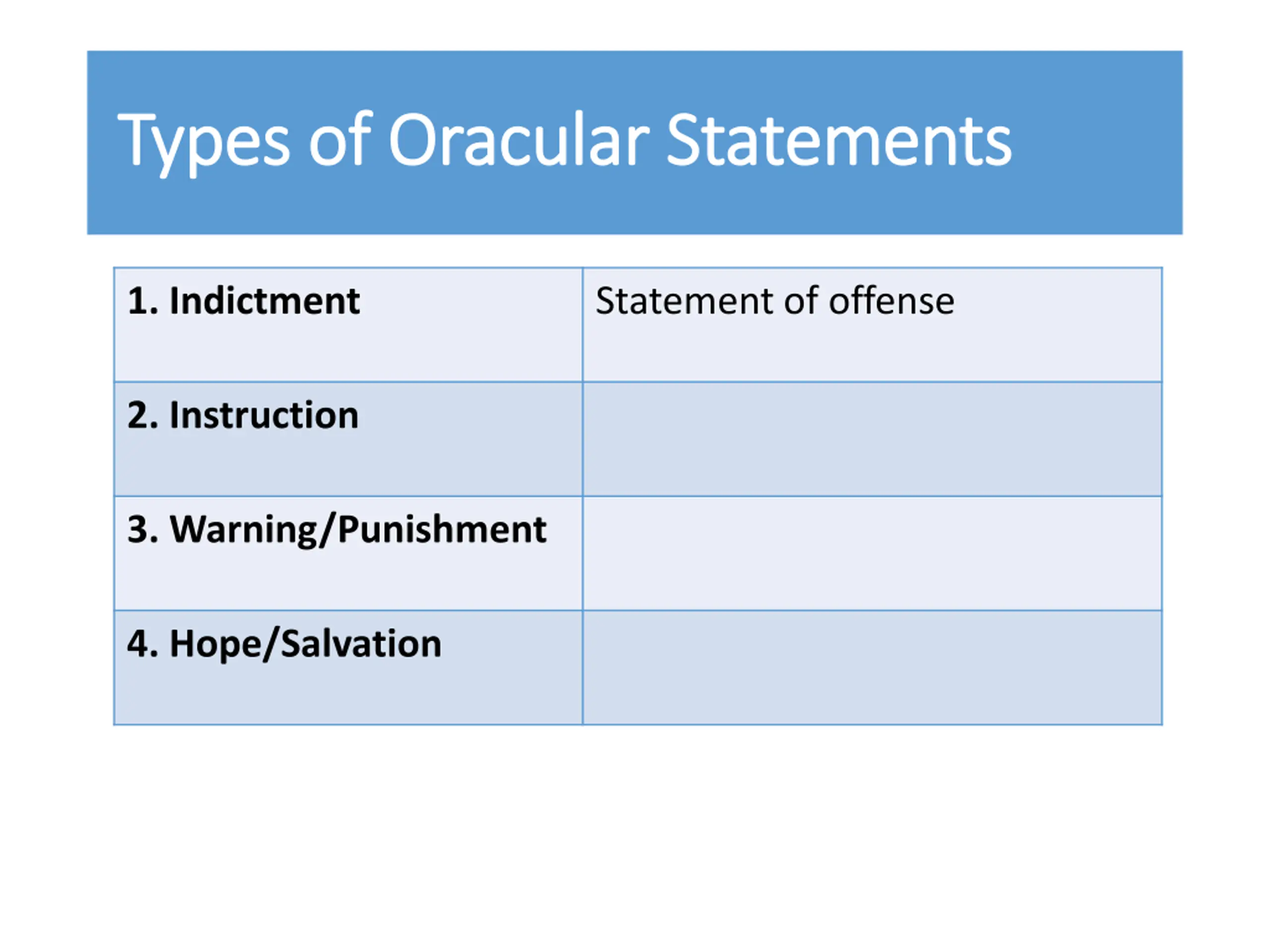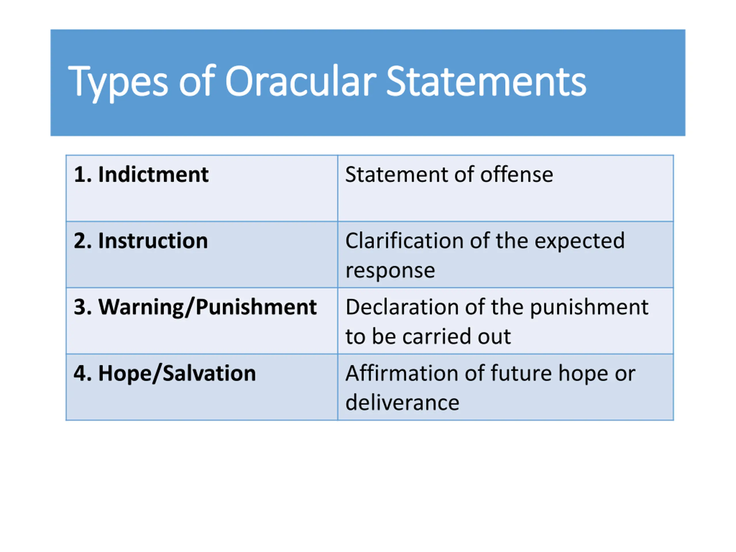 Types of Oracular Statements Types of Oracular Statements 1. Indictment Statement of offense 2. Instruction Clarification of the expected response 3. Warning/Punishment Declaration of the punishment to be carried out 4. Hope/Salvation