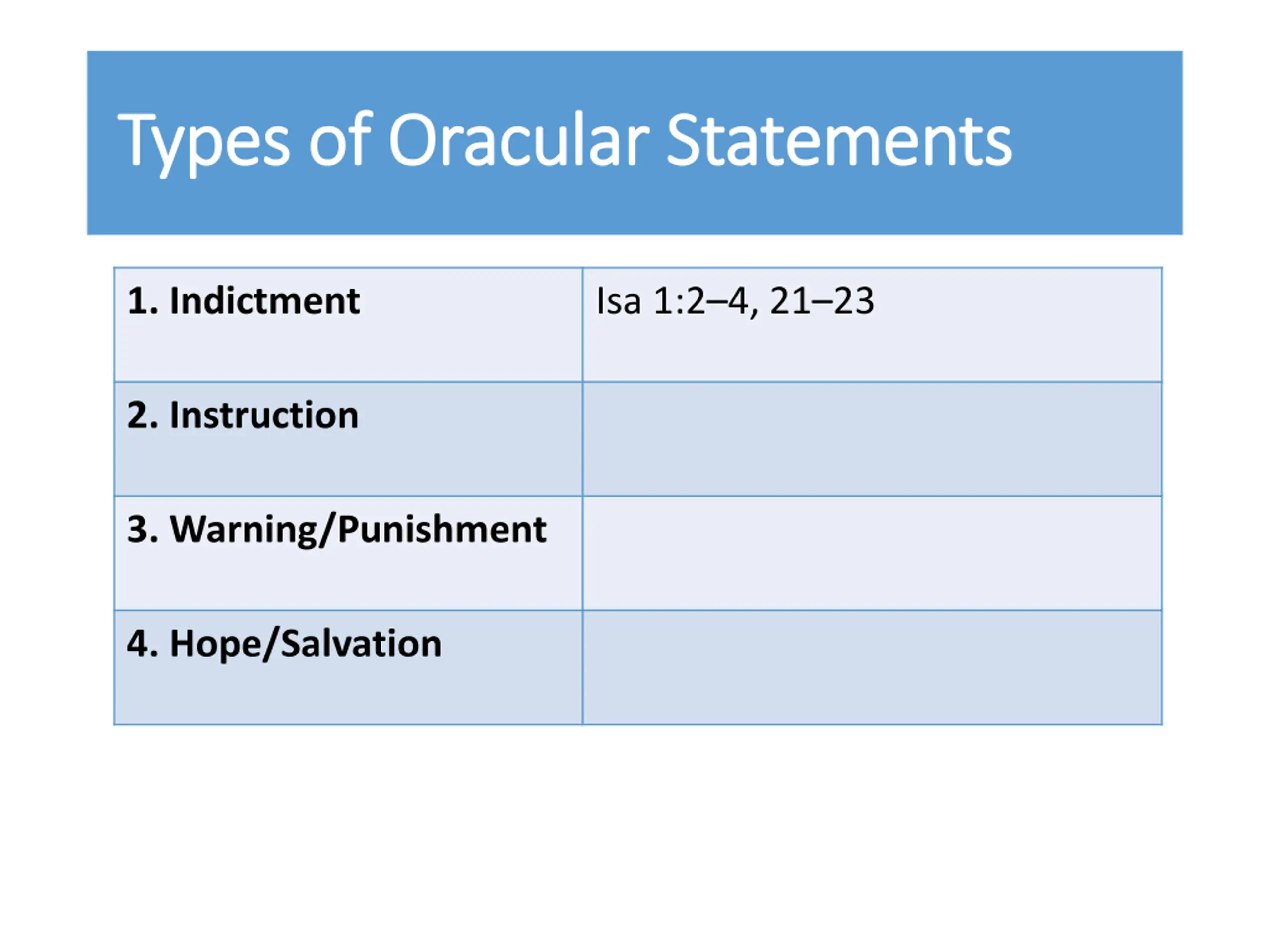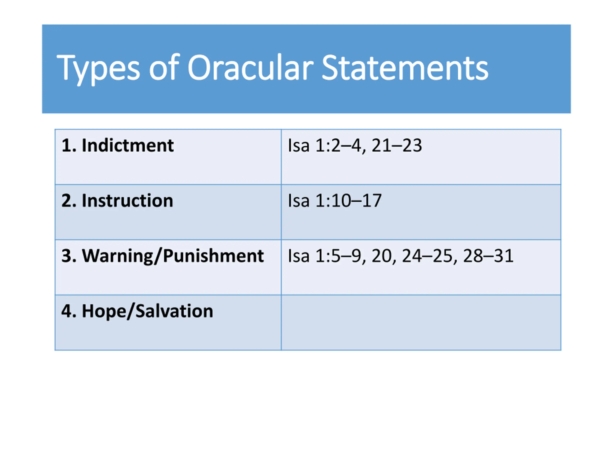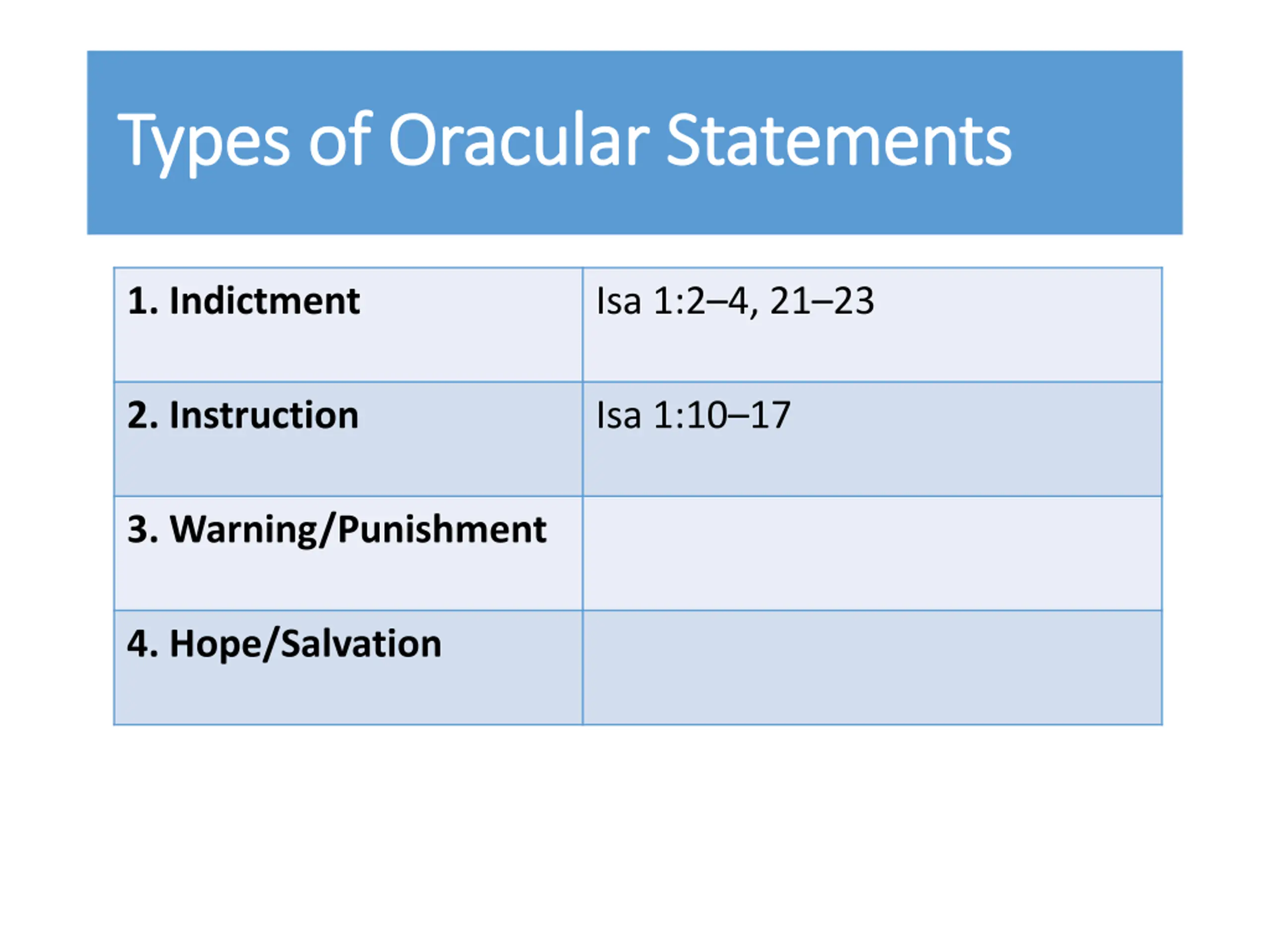 Types of Oracular Statements Types of Oracular Statements 1. Indictment Isa 1:2 4, 21 23 2. Instruction Isa 1:10 17 3. Warning/Punishment Isa 1:5 9, 20, 24 25, 28 31 4. Hope/Salvation Isa 1:18 19, 26, 27