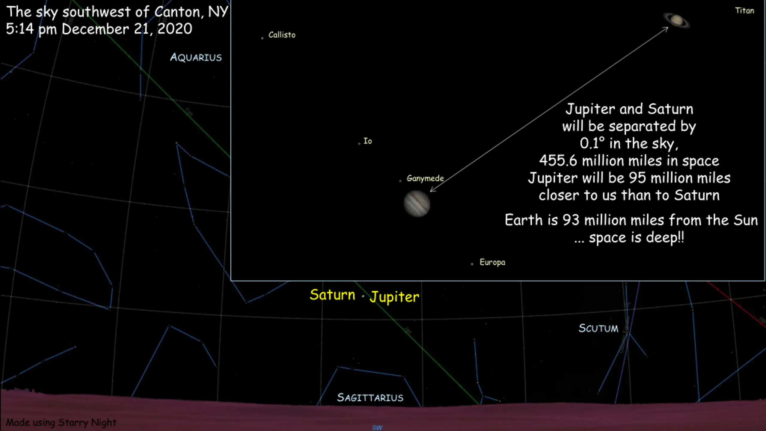 The sky southwest of Canton, NY 5:14 pm December 21, 2020 Titan Callisto AQUARIUS AQUILA Jupiter and Saturn will be separated by 0.1 in the sky, 455.6 million miles in space Jupiter will be 95 million miles closer to us than to Saturn Earth is 93 million miles from the Sun ... space is deep!! Io Ganymede CAPRICORNUS Europa Saturn Jupiter SCUTUM SAGITTARIUS Made using Starry Night