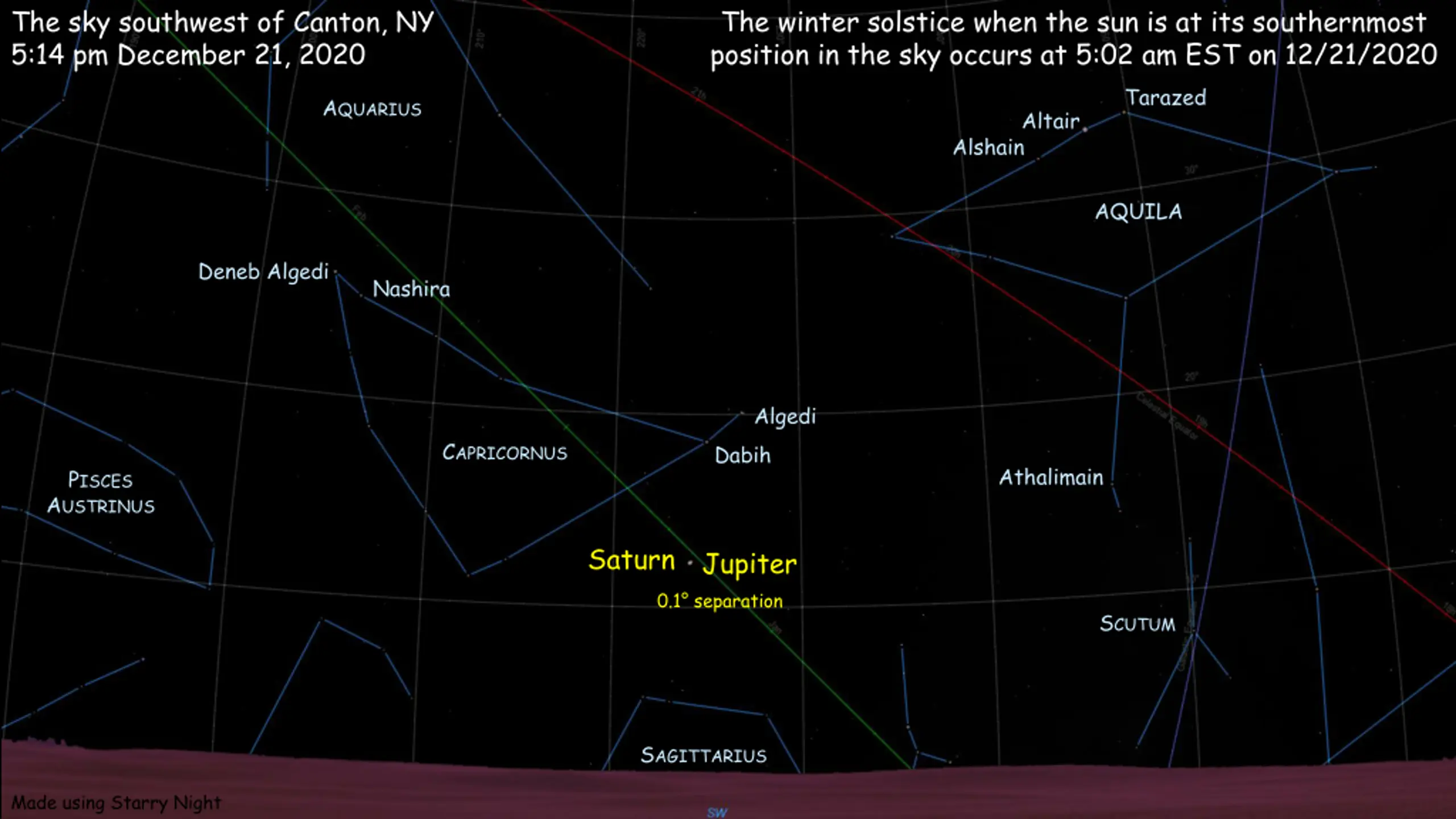 The sky southwest of Canton, NY 5:14 pm December 21, 2020 The winter solstice when the sun is at its southernmost position in the sky occurs at 5:02 am EST on 12/21/2020 Tarazed AQUARIUS Altair Alshain AQUILA Deneb Algedi Nashira Algedi CAPRICORNUS Dabih Athalimain PISCES AUSTRINUS Saturn Jupiter 0.1 separation SCUTUM SAGITTARIUS Made using Starry Night