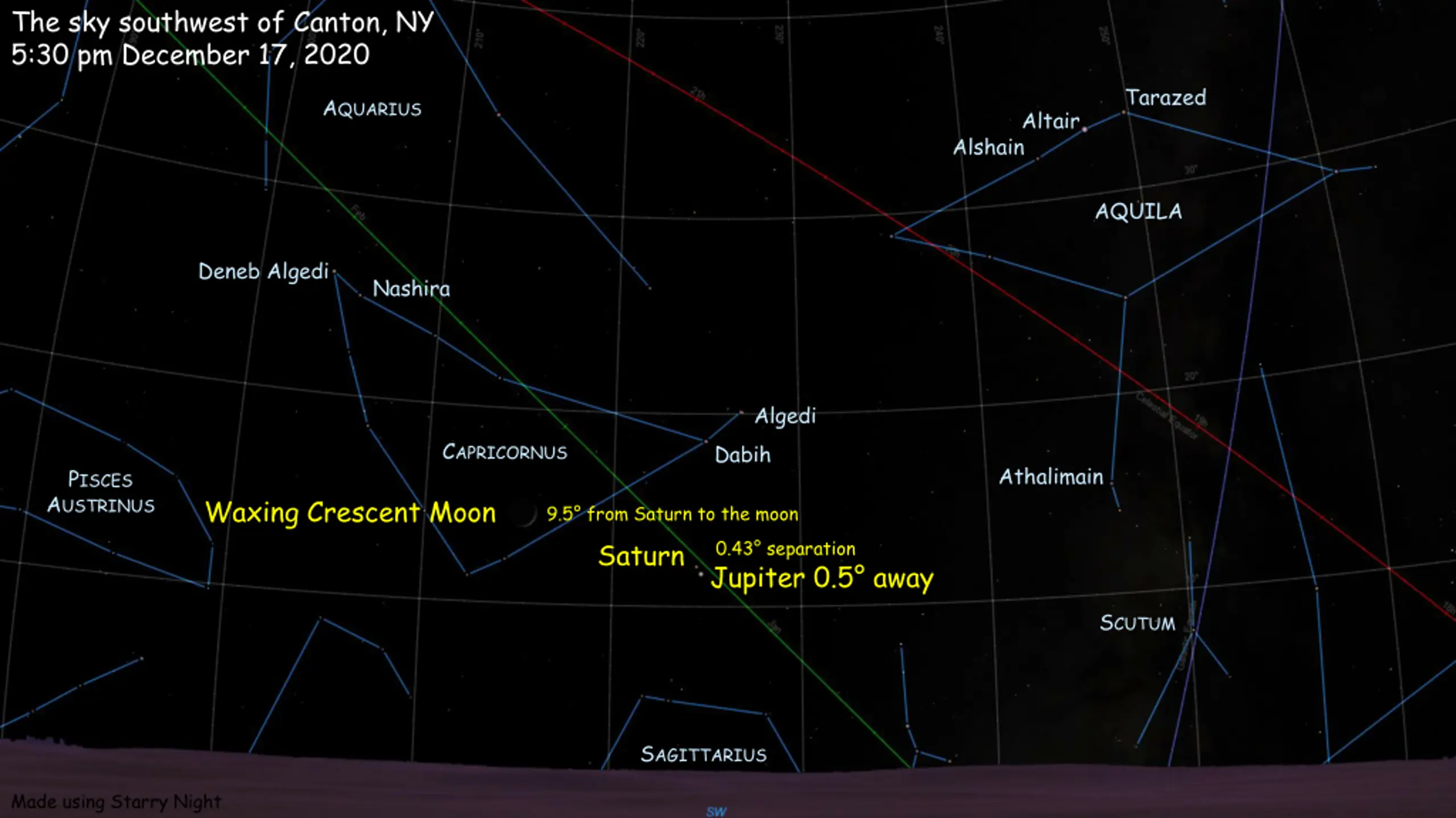 The sky southwest of Canton, NY 5:30 pm December 17, 2020 Tarazed AQUARIUS Altair Alshain AQUILA Deneb Algedi Nashira Algedi CAPRICORNUS Dabih Athalimain PISCES AUSTRINUS Waxing Crescent Moon 9.5 from Saturn to the moon 0.43 separation Saturn Jupiter 0.5 away SCUTUM SAGITTARIUS Made using Starry Night