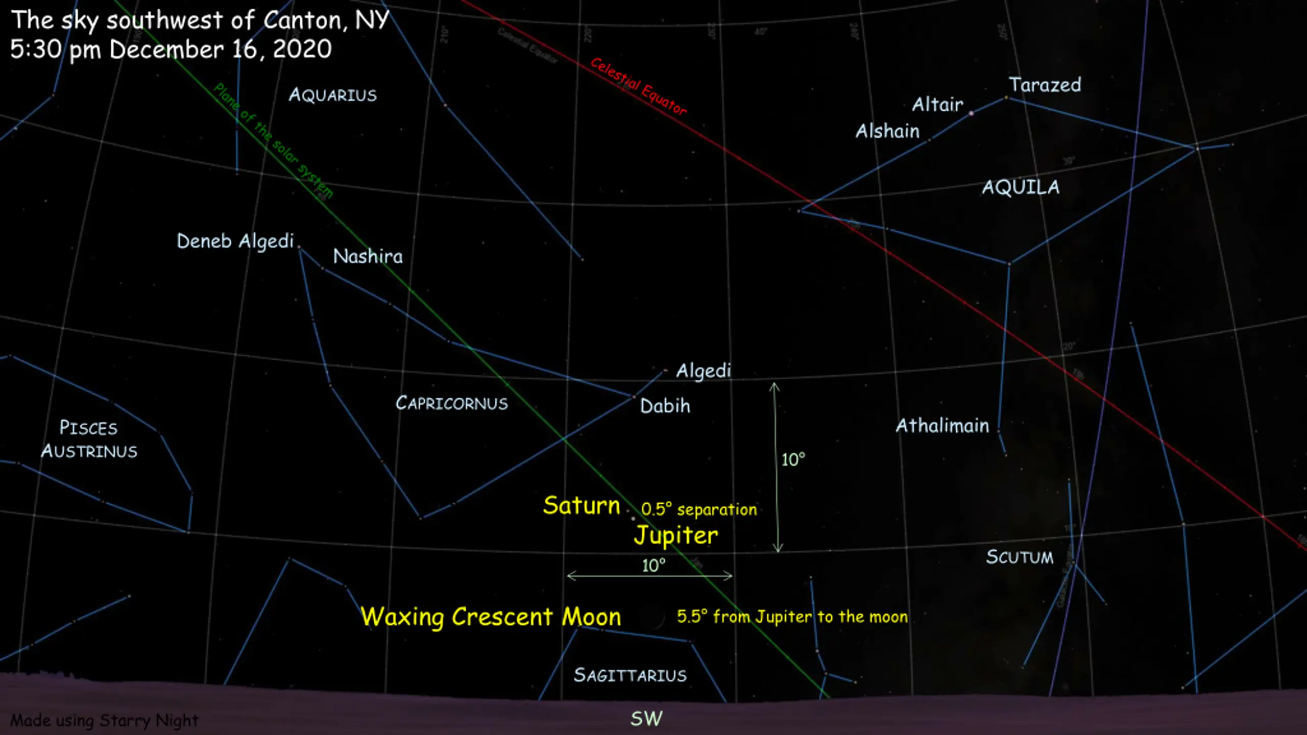 The sky southwest of Canton, NY 5:30 pm December 16, 2020 Tarazed AQUARIUS Altair Alshain AQUILA Deneb Algedi Nashira Algedi CAPRICORNUS Dabih Athalimain PISCES AUSTRINUS 10 Saturn 0.5 separation Jupiter 10 SCUTUM Waxing Crescent Moon 5.5 from Jupiter to the moon SAGITTARIUS SW Made using Starry Night