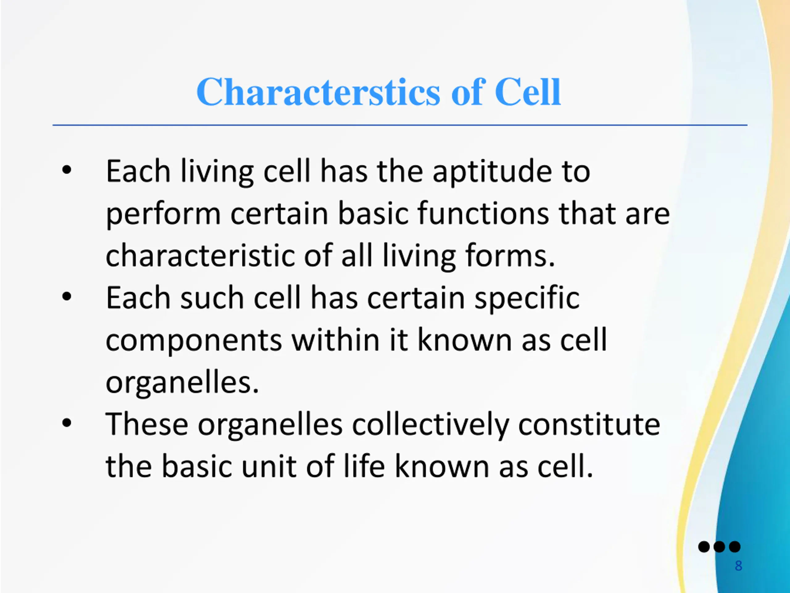 Characterstics of Cell Each living cell has the aptitude to perform certain basic functions that are characteristic of all living forms. Each such cell has certain specific components within it known as cell organelles. These organelles collectively constitute the basic unit of life known as cell. 8