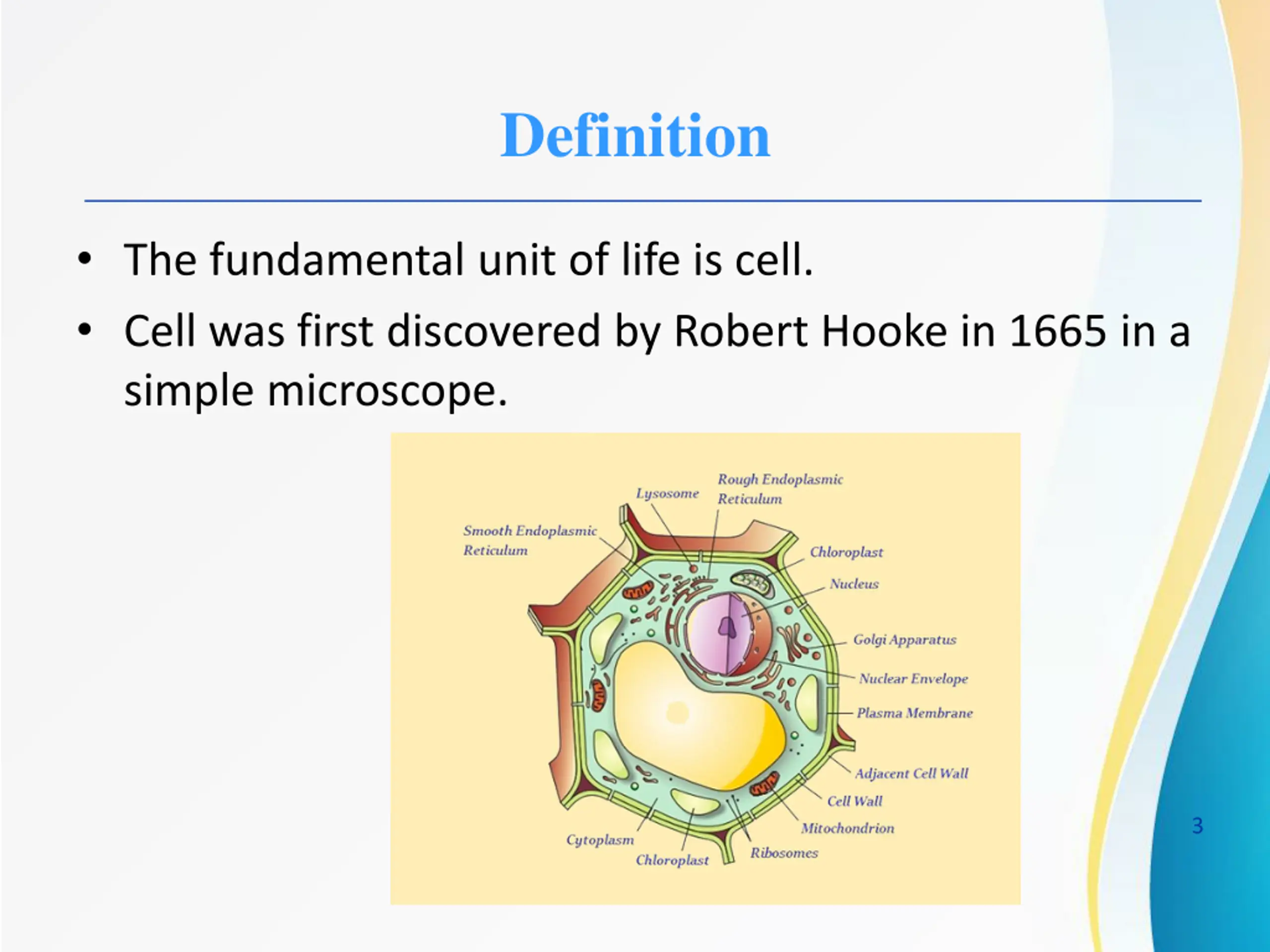 Definition The fundamental unit of life is cell. Cell was first discovered by Robert Hooke in 1665 in a simple microscope. 3