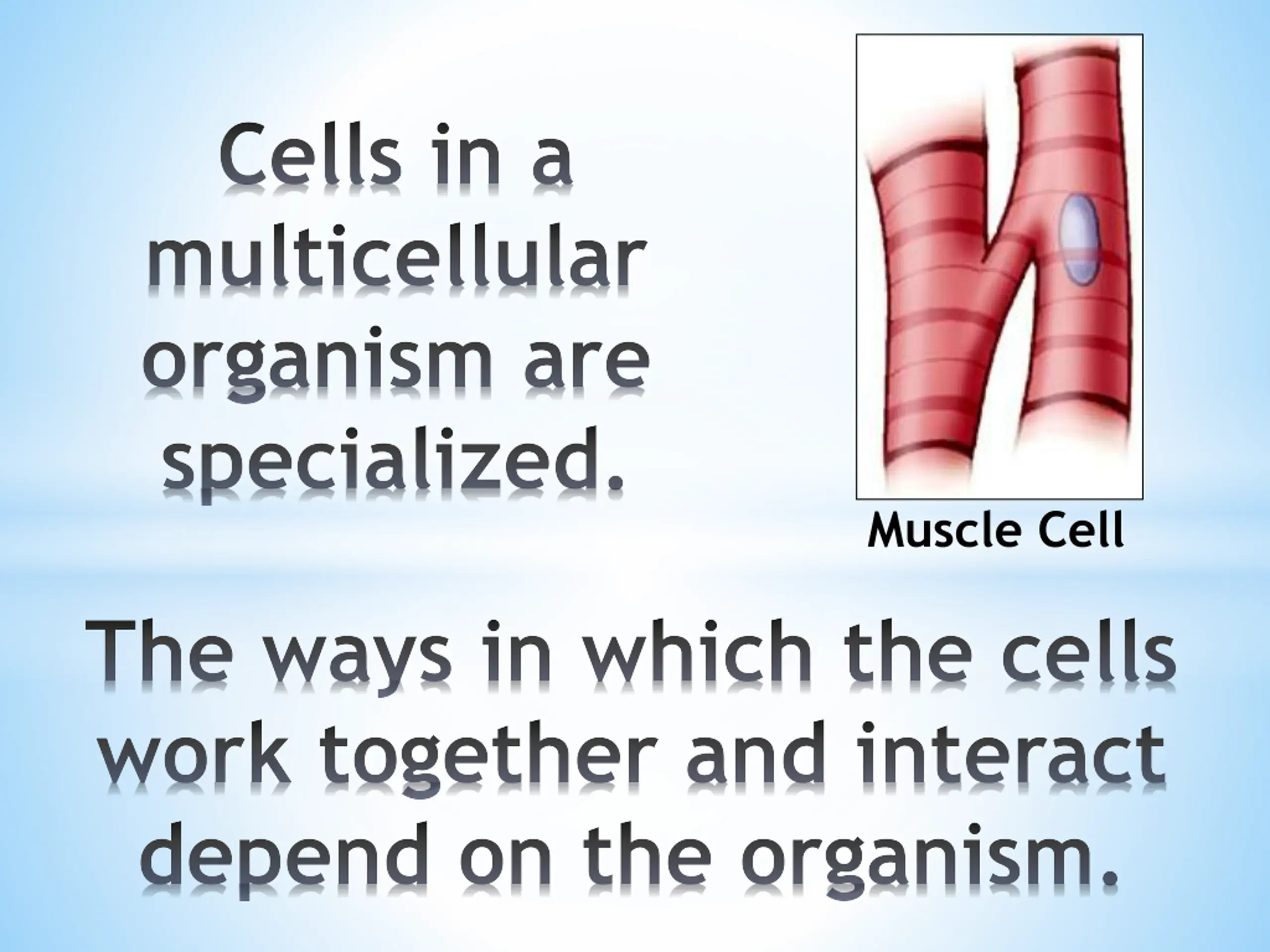 Cells in a multicellular organism are specialized. Muscle Cell The ways in which the cells work together and interact depend on the organism.
