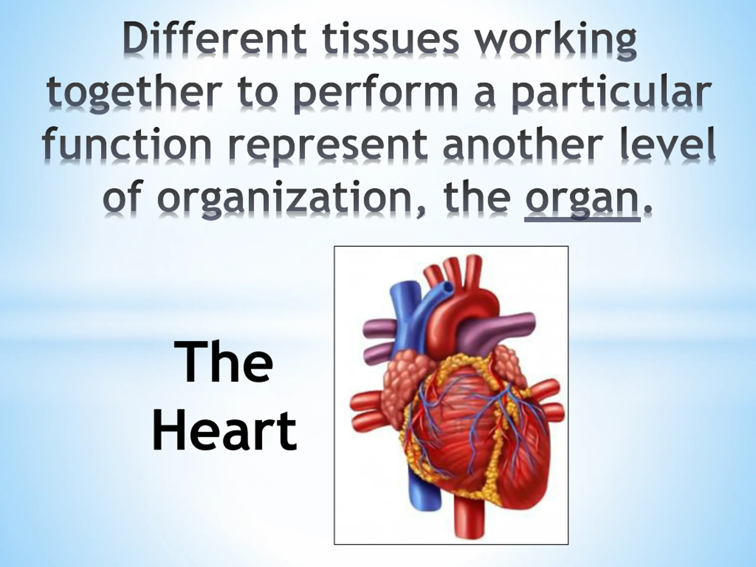 Different tissues working together to perform a particular function represent another level of organization, the organ. The Heart