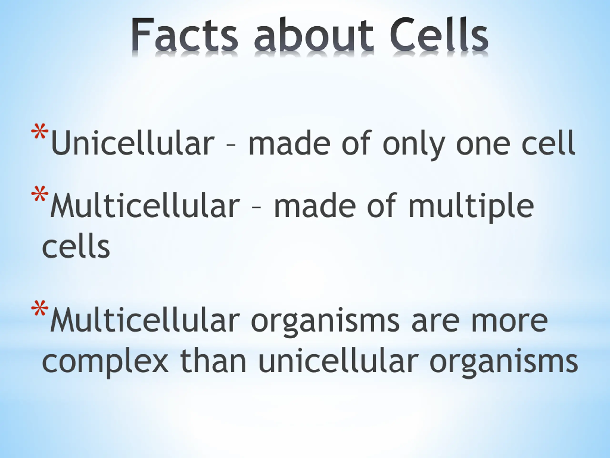 Facts about Cells *Unicellular made of only one cell *Multicellular made of multiple cells *Multicellular organisms are more complex than unicellular organisms