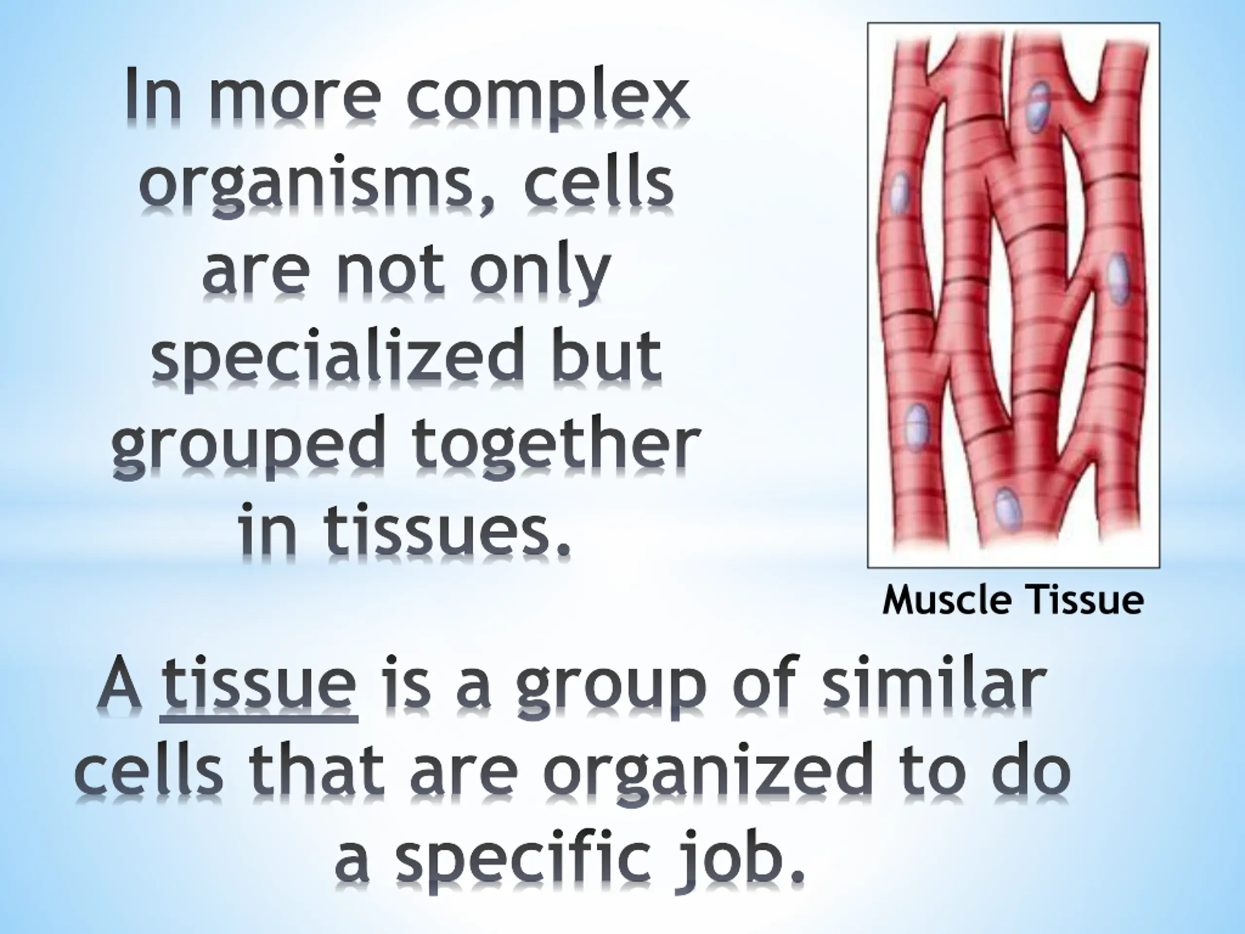 In more complex organisms, cells are not only specialized but grouped together in tissues. Muscle Tissue A tissue is a group of similar cells that are organized to do a specific job.