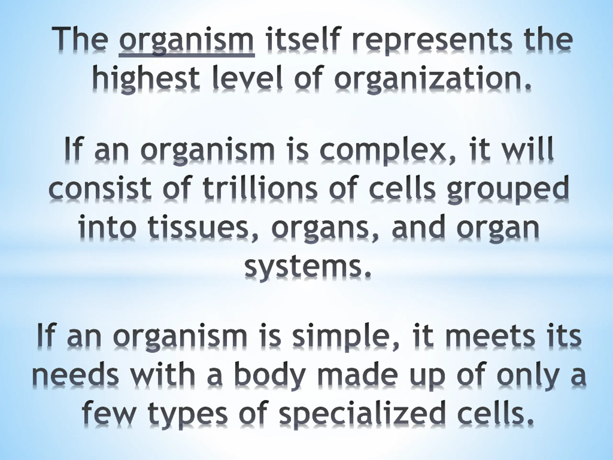 The organism itself represents the highest level of organization. If an organism is complex, it will consist of trillions of cells grouped into tissues, organs, and organ systems. If an organism is simple, it meets its needs with a body made up of only a few types of specialized cells.