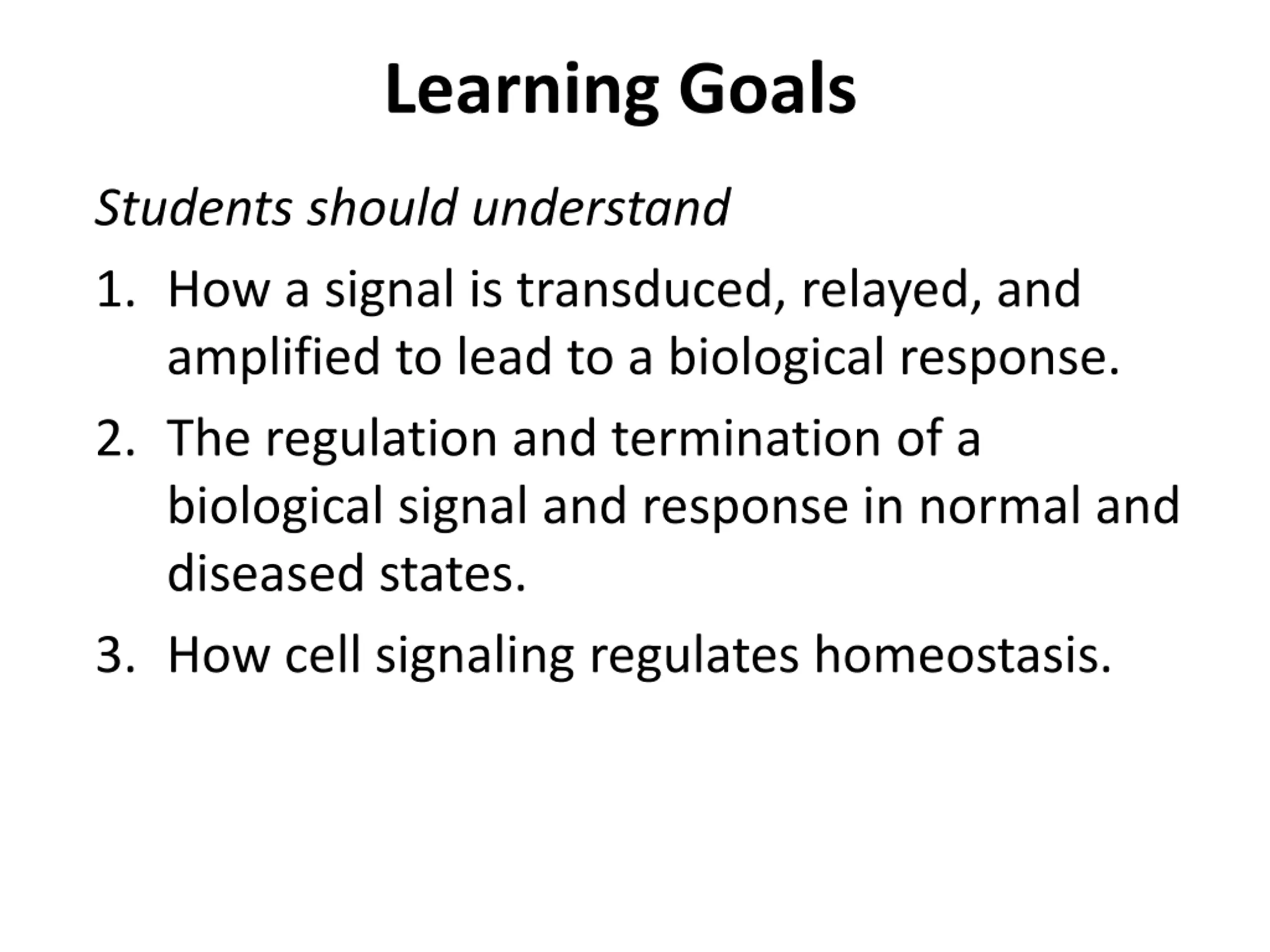 Learning Goals Students should understand 1. How a signal is transduced, relayed, and amplified to lead to a biological response. 2. The regulation and termination of a biological signal and response in normal and diseased states. 3. How cell signaling regulates homeostasis.
