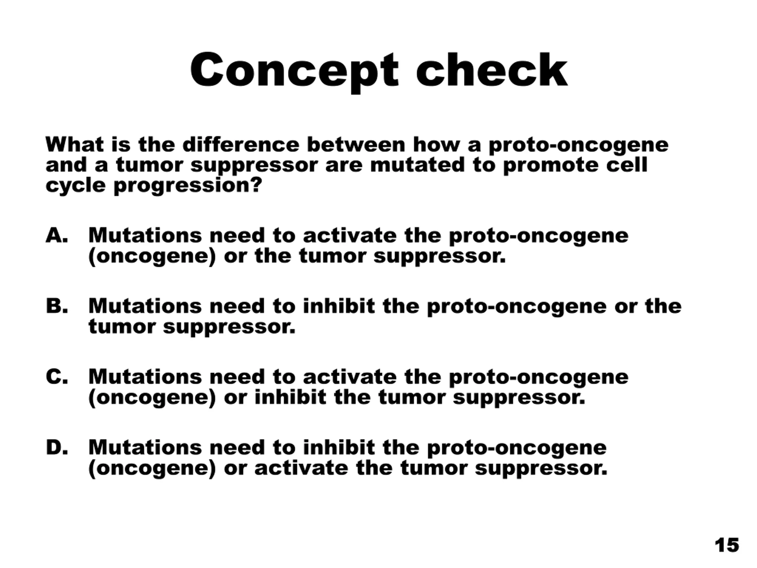 Concept check What is the difference between how a proto-oncogene and a tumor suppressor are mutated to promote cell cycle progression? A. Mutations need to activate the proto-oncogene (oncogene) or the tumor suppressor. B. Mutations need to inhibit the proto-oncogene or the tumor suppressor. C. Mutations need to activate the proto-oncogene (oncogene) or inhibit the tumor suppressor. D. Mutations need to inhibit the proto-oncogene (oncogene) or activate the tumor suppressor. 15 15