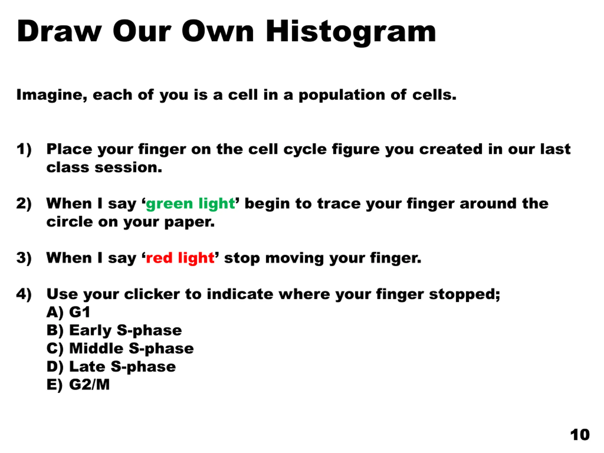 Draw Our Own Histogram Imagine, each of you is a cell in a population of cells. 1) Place your finger on the cell cycle figure you created in our last class session. 2) When I say green light begin to trace your finger around the circle on your paper. 3) When I say red light stop moving your finger. 4) Use your clicker to indicate where your finger stopped; A) G1 B) Early S-phase C) Middle S-phase D) Late S-phase E) G2/M 10 10