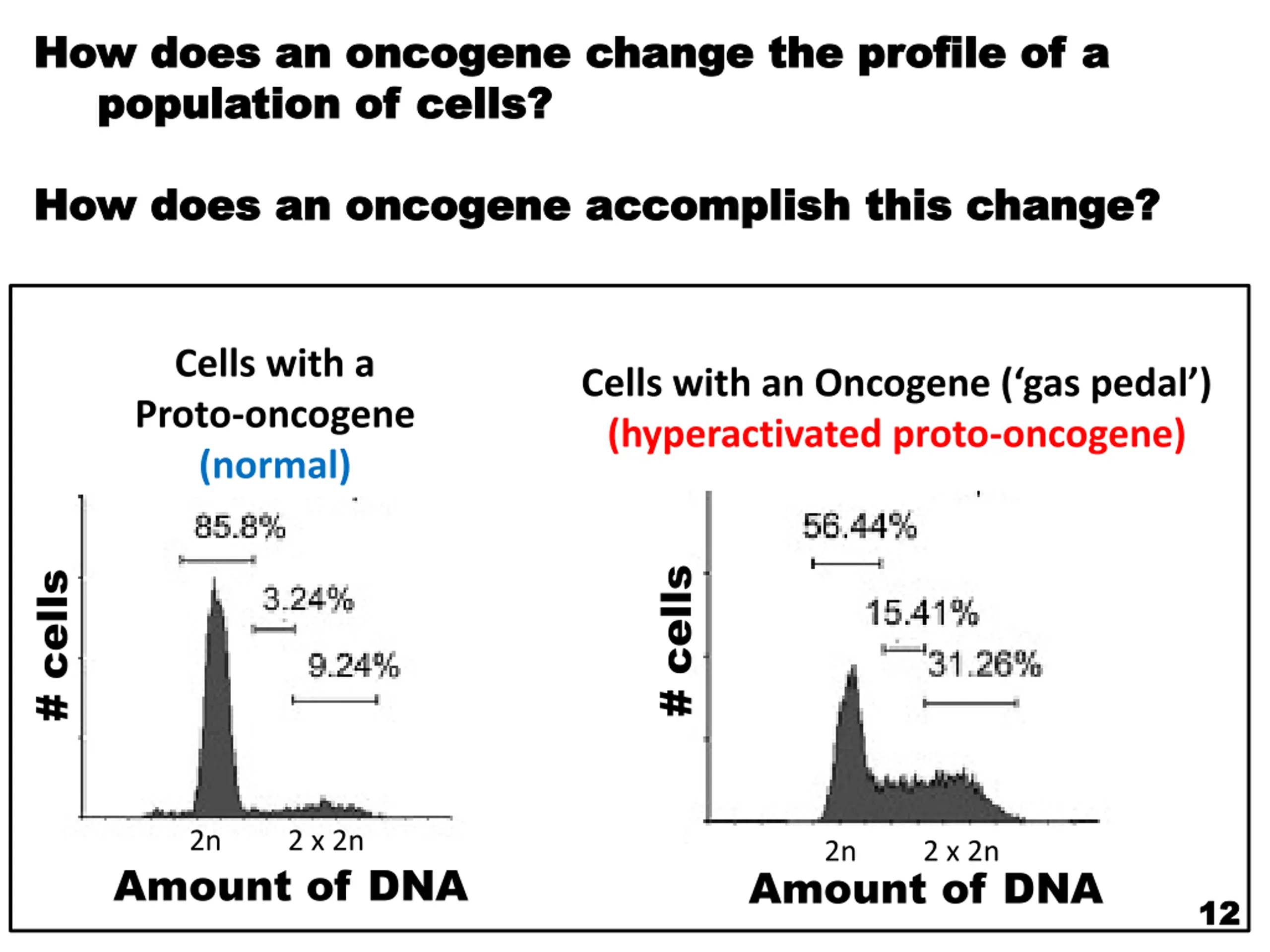 How does an oncogene change the profile of a How does an oncogene change the profile of a population of cells? population of cells? How does an oncogene accomplish this change? How does an oncogene accomplish this change? Cells with a Proto-oncogene (normal) Cells with an Oncogene ( gas pedal ) (hyperactivated proto-oncogene) # cells # cells 2n 2 x 2n 2n 2 x 2n Amount of DNA Amount of DNA 12 12