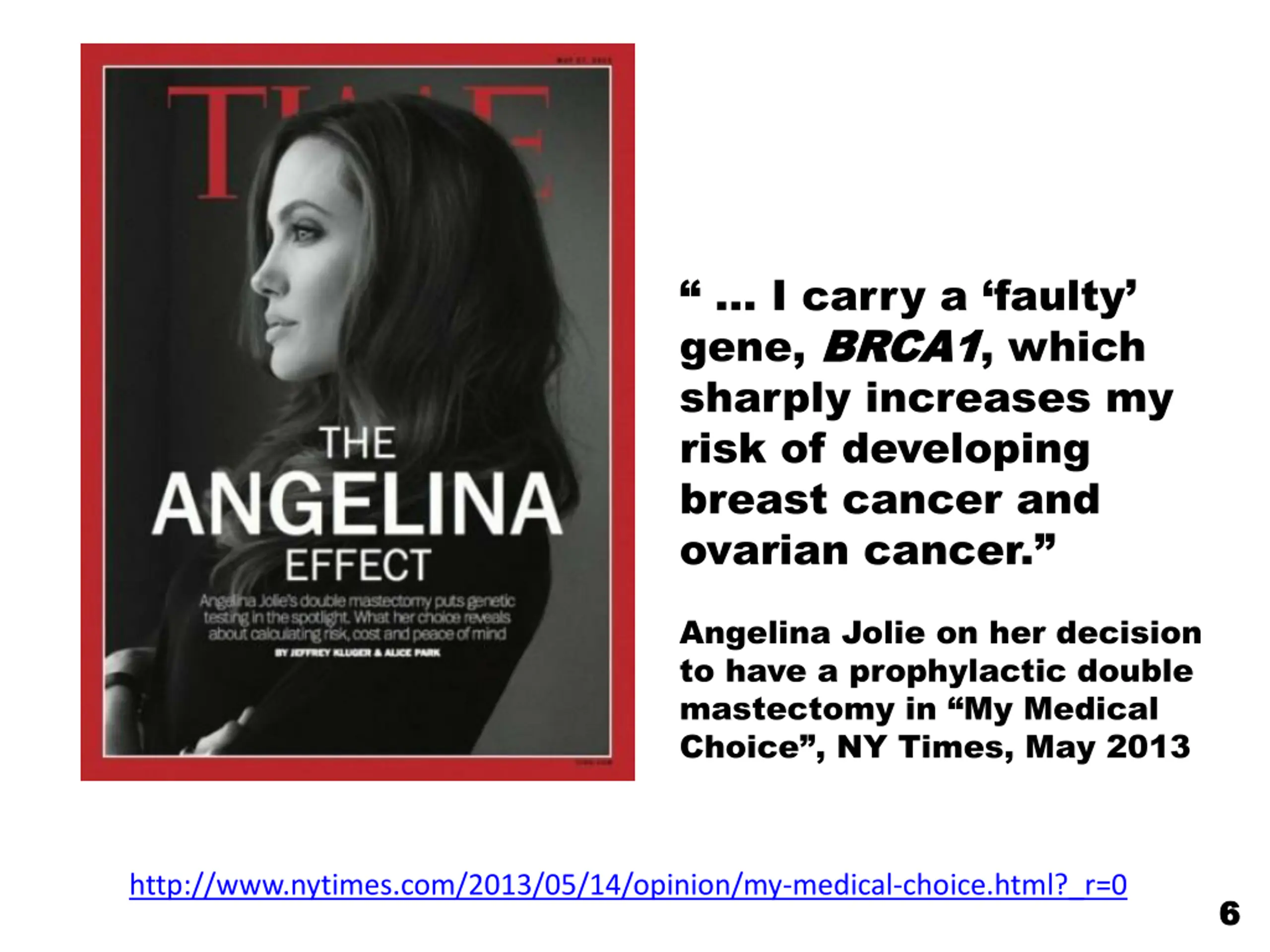 I carry a faulty gene, BRCA1 BRCA1, which sharply increases my risk of developing breast cancer and ovarian cancer. Angelina Jolie on her decision to have a prophylactic double mastectomy in My Medical Choice , NY Times, May 2013 http://www.nytimes.com/2013/05/14/opinion/my-medical-choice.html?_r=0 6 6