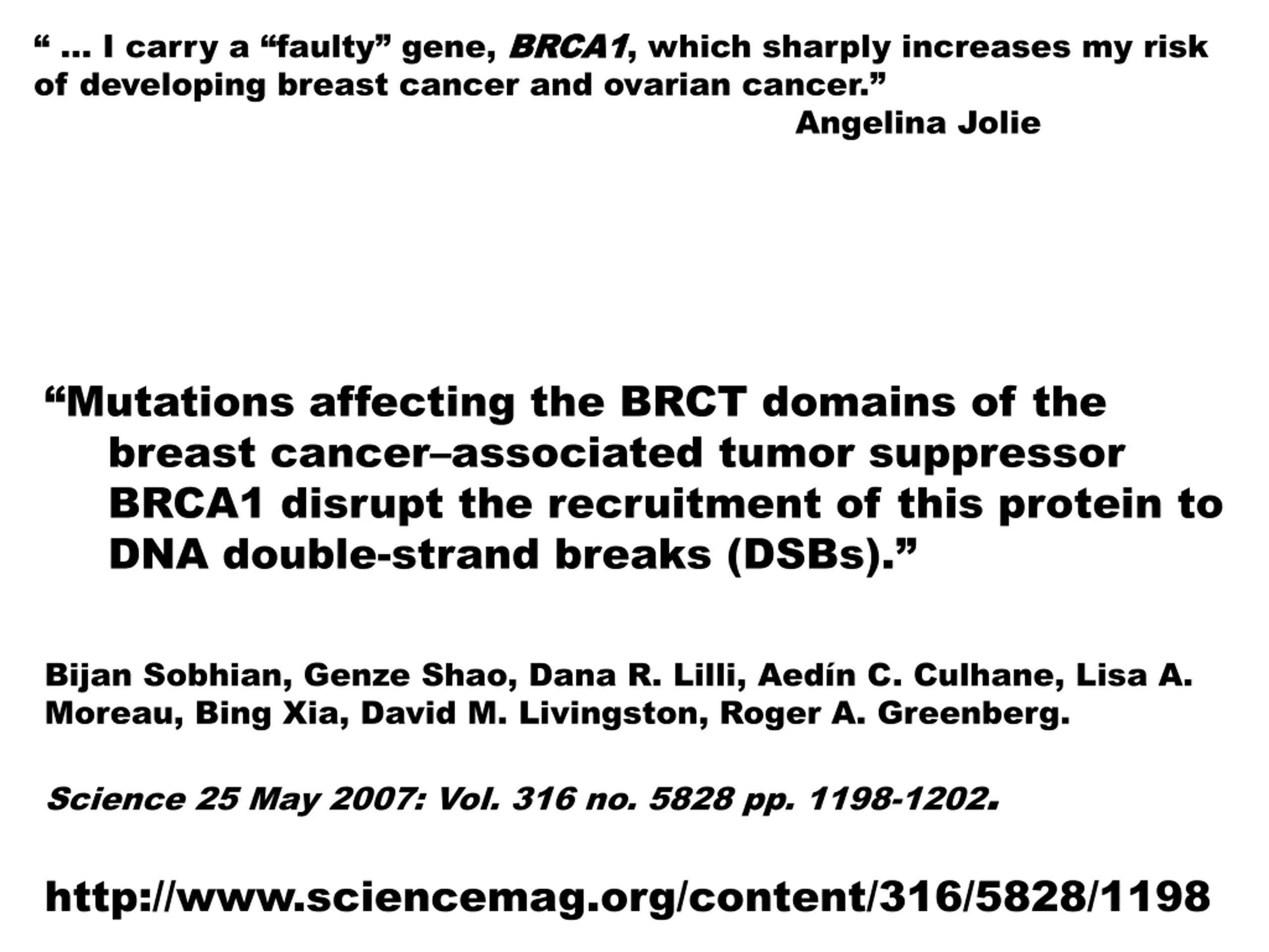 I carry a faulty gene, BRCA1 of developing breast cancer and ovarian cancer. BRCA1, which sharply increases my risk Angelina Jolie Mutations affecting the BRCT domains of the breast cancer associated tumor suppressor BRCA1 disrupt the recruitment of this protein to DNA double-strand breaks (DSBs). Bijan Sobhian, Genze Shao, Dana R. Lilli, Aed n C. Culhane, Lisa A. Moreau, Bing Xia, David M. Livingston, Roger A. Greenberg. Science 25 May 2007: Vol. 316 no. 5828 pp. 1198-1202. http://www.sciencemag.org/content/316/5828/1198