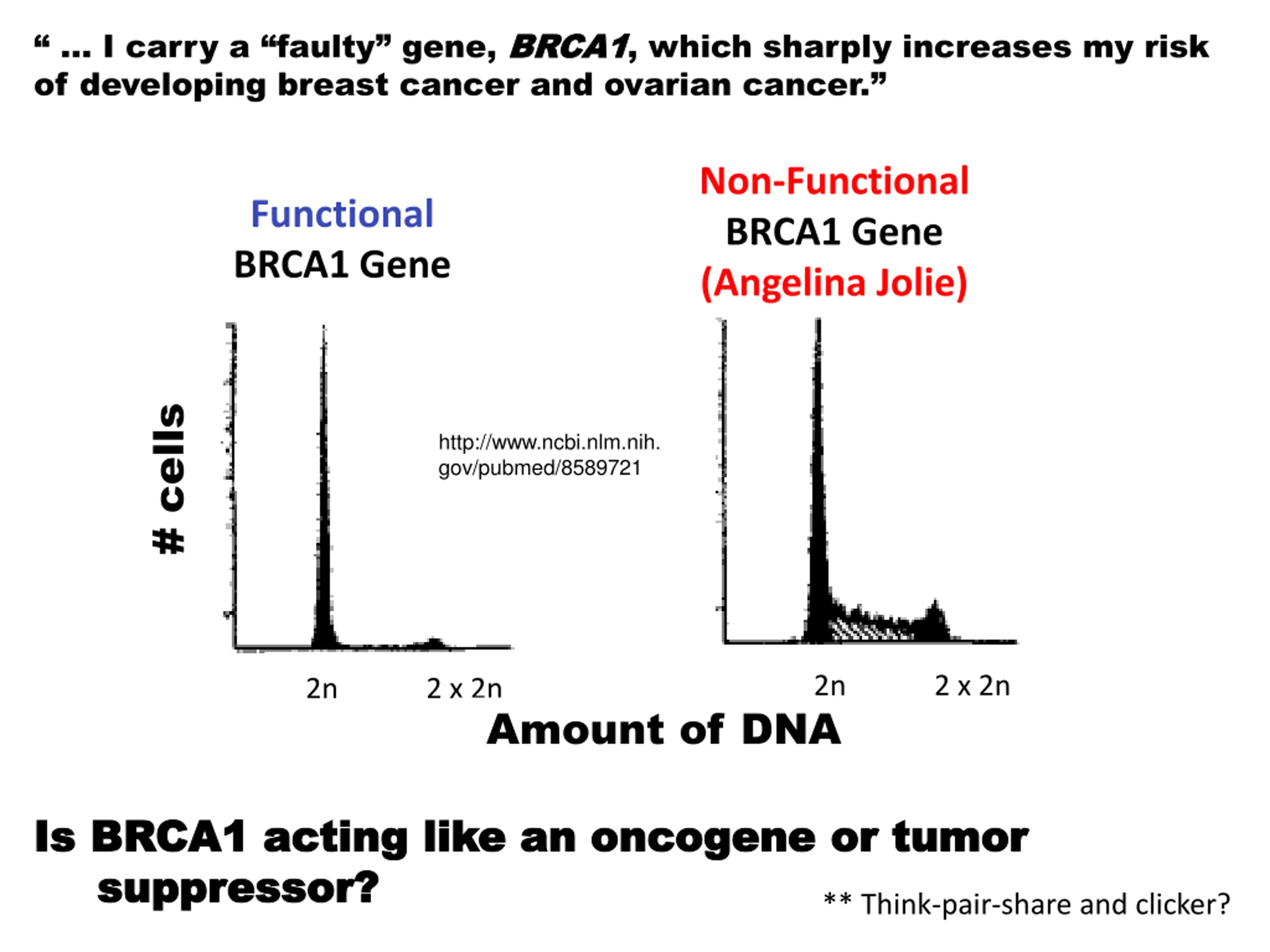 I carry a faulty gene, BRCA1 of developing breast cancer and ovarian cancer. BRCA1, which sharply increases my risk Non-Functional BRCA1 Gene (Angelina Jolie) Functional BRCA1 Gene # cells http://www.ncbi.nlm.nih. gov/pubmed/8589721 2n 2 x 2n 2n 2 x 2n Amount of DNA Is BRCA1 acting like an oncogene or tumor Is BRCA1 acting like an oncogene or tumor suppressor? suppressor? ** Think-pair-share and clicker?