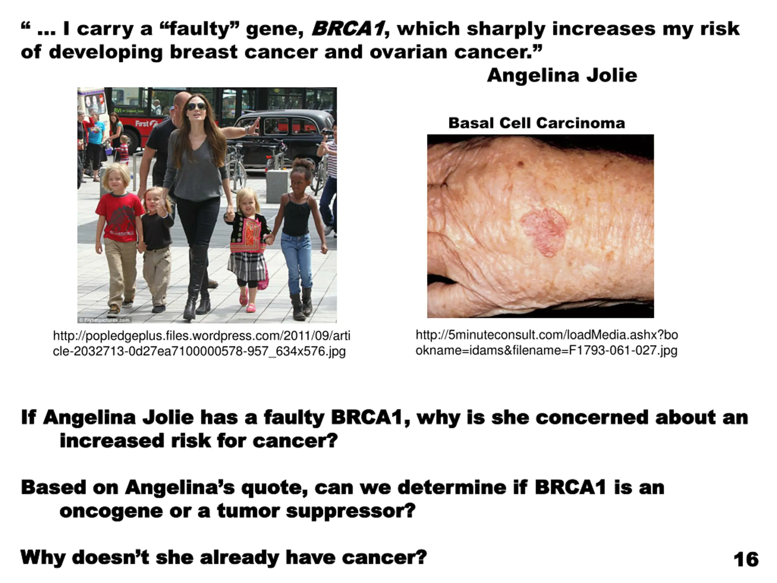 I carry a faulty gene, BRCA1 of developing breast cancer and ovarian cancer. BRCA1, which sharply increases my risk Angelina Jolie Basal Cell Carcinoma http://5minuteconsult.com/loadMedia.ashx?bo okname=idams&filename=F1793-061-027.jpg http://popledgeplus.files.wordpress.com/2011/09/arti cle-2032713-0d27ea7100000578-957_634x576.jpg If Angelina Jolie has a faulty BRCA1, why is she concerned about an If Angelina Jolie has a faulty BRCA1, why is she concerned about an increased risk for cancer? increased risk for cancer? Based on Angelina s quote, can we determine if BRCA1 is an Based on Angelina s quote, can we determine if BRCA1 is an oncogene or a tumor suppressor? oncogene or a tumor suppressor? Why doesn t she already have cancer? Why doesn t she already have cancer? 16 16