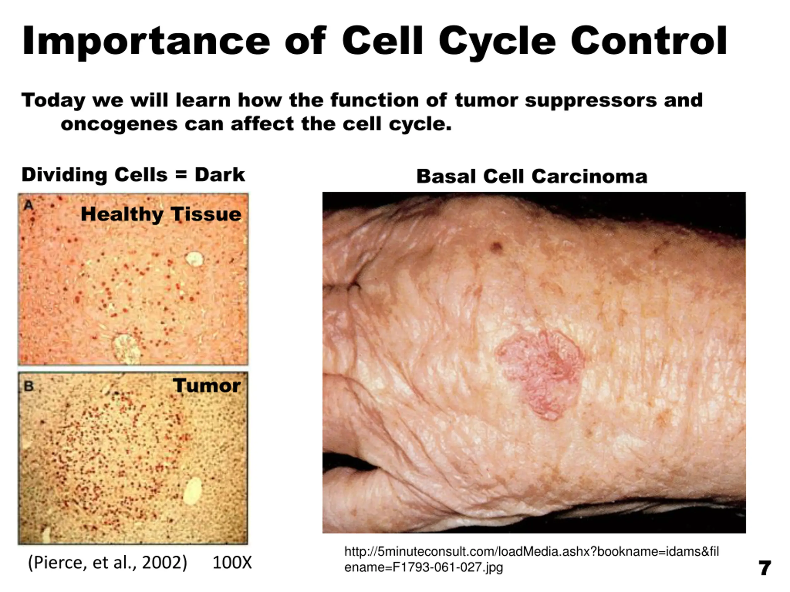 Importance of Cell Cycle Control Today we will learn how the function of tumor suppressors and oncogenes can affect the cell cycle. Dividing Cells = Dark Basal Cell Carcinoma Healthy Tissue Tumor http://5minuteconsult.com/loadMedia.ashx?bookname=idams&fil ename=F1793-061-027.jpg 7 7 (Pierce, et al., 2002) 100X