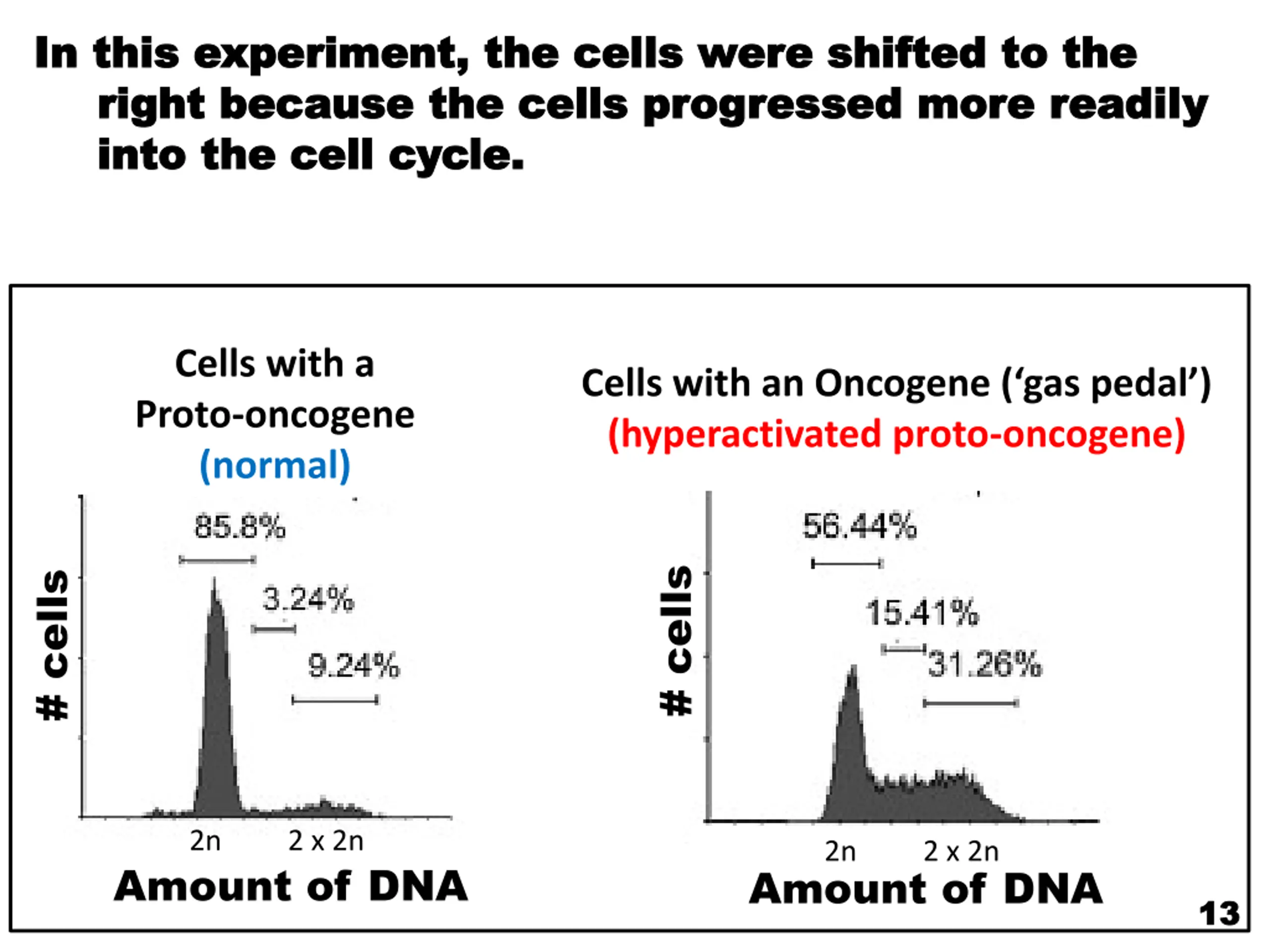 In this experiment, the cells were shifted to the In this experiment, the cells were shifted to the right because the cells progressed more readily right because the cells progressed more readily into the cell cycle. into the cell cycle. Cells with a Proto-oncogene (normal) Cells with an Oncogene ( gas pedal ) (hyperactivated proto-oncogene) # cells # cells 2n 2 x 2n 2n 2 x 2n Amount of DNA Amount of DNA 13 13