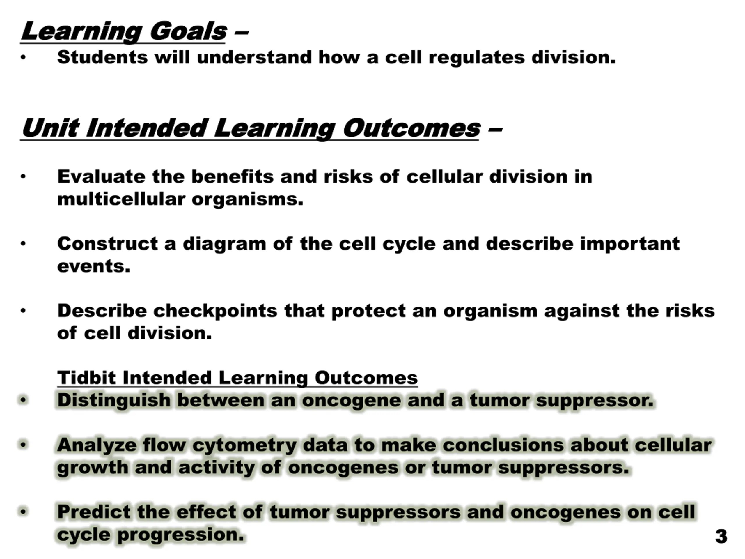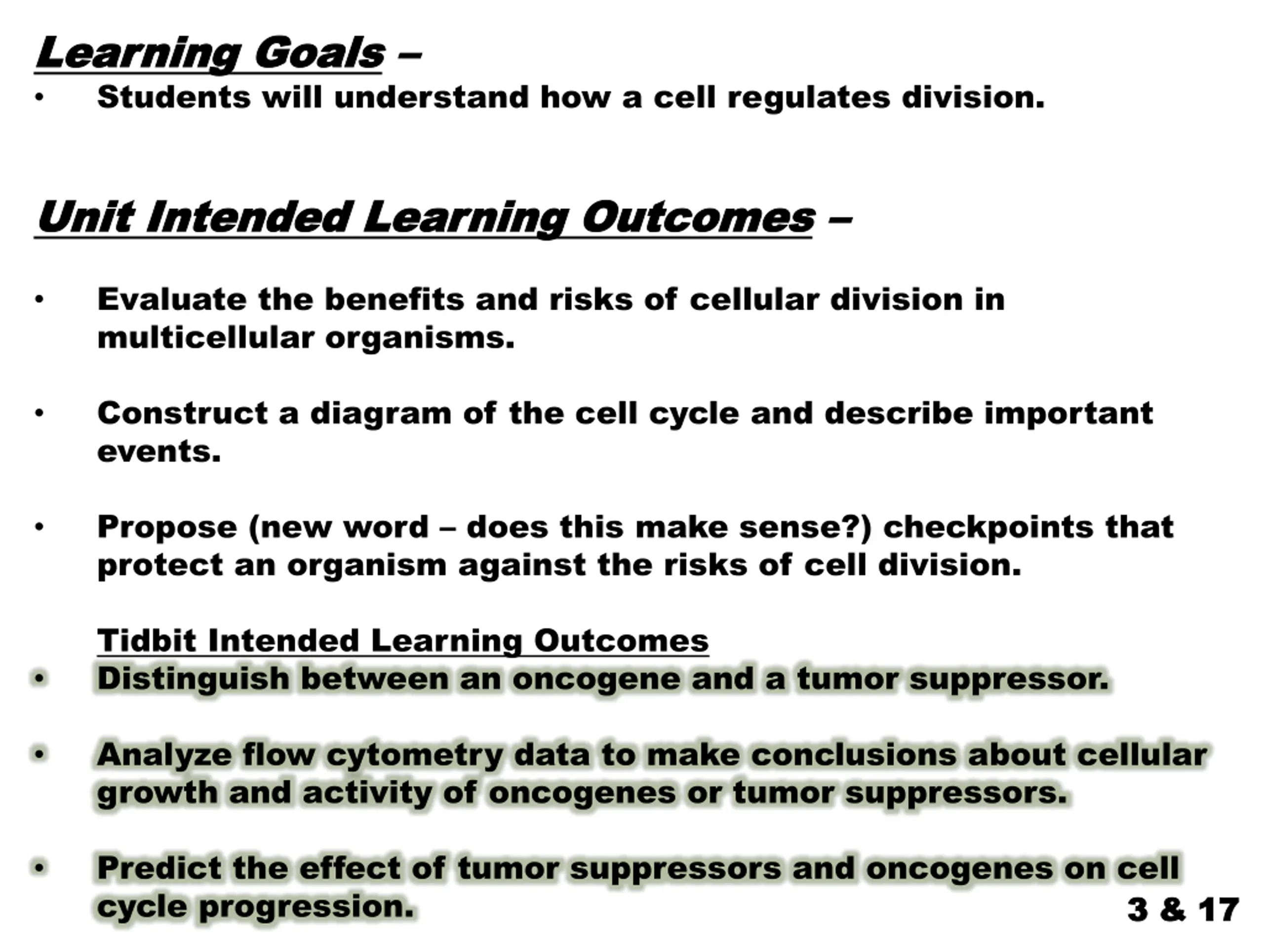 Learning Goals Learning Goals Students will understand how a cell regulates division. Unit Intended Learning Outcomes Unit Intended Learning Outcomes Evaluate the benefits and risks of cellular division in multicellular organisms. Construct a diagram of the cell cycle and describe important events. Propose (new word does this make sense?) checkpoints that protect an organism against the risks of cell division. Tidbit Intended Learning Outcomes Distinguish between an oncogene and a tumor suppressor. Analyze flow cytometry data to make conclusions about cellular growth and activity of oncogenes or tumor suppressors. Predict the effect of tumor suppressors and oncogenes on cell cycle progression. 3 & 17 3 & 17
