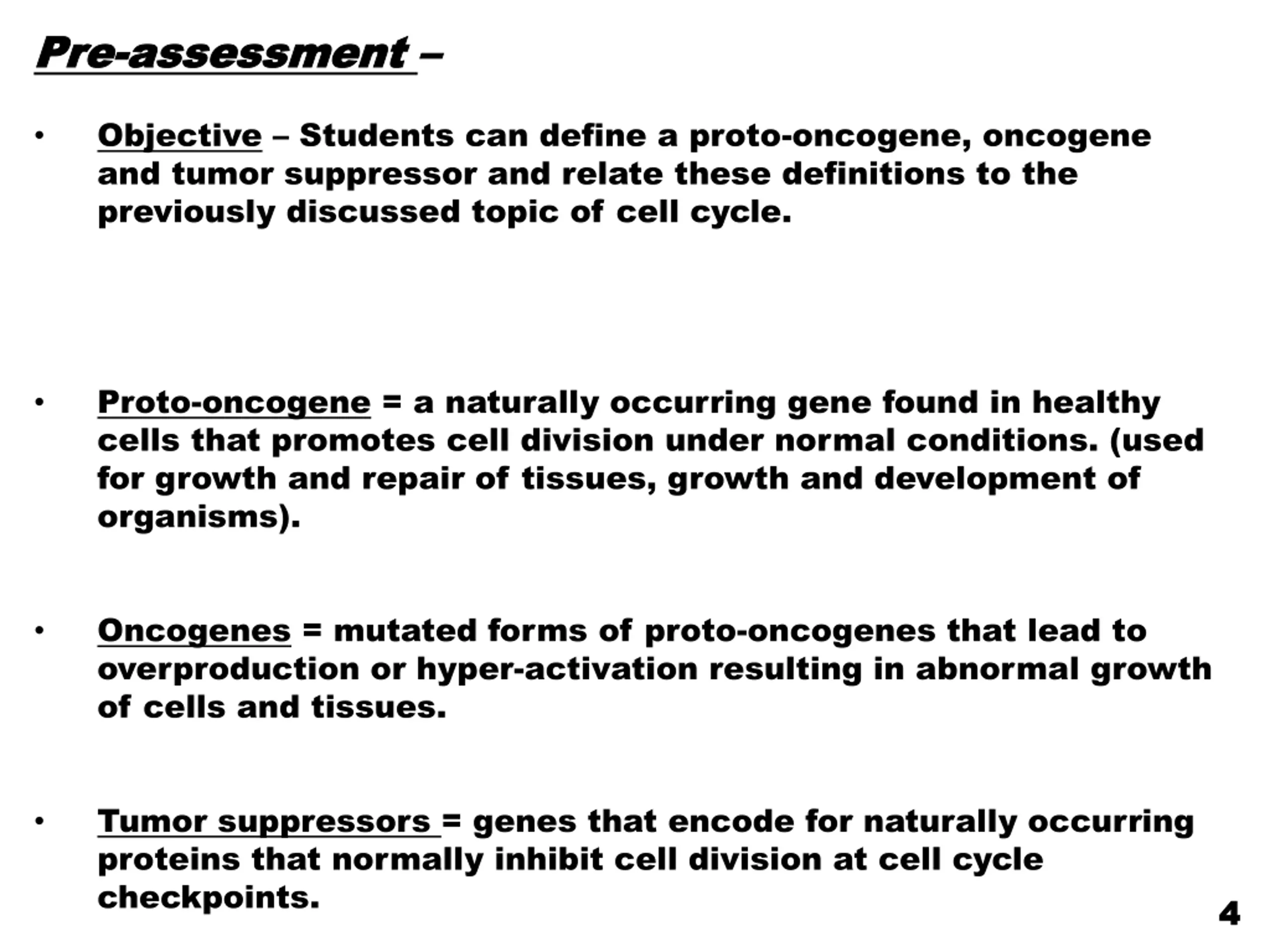 Pre Pre- -assessment assessment Objective Students can define a proto-oncogene, oncogene and tumor suppressor and relate these definitions to the previously discussed topic of cell cycle. Proto-oncogene = a naturally occurring gene found in healthy cells that promotes cell division under normal conditions. (used for growth and repair of tissues, growth and development of organisms). Oncogenes = mutated forms of proto-oncogenes that lead to overproduction or hyper-activation resulting in abnormal growth of cells and tissues. Tumor suppressors = genes that encode for naturally occurring proteins that normally inhibit cell division at cell cycle checkpoints. 4 4