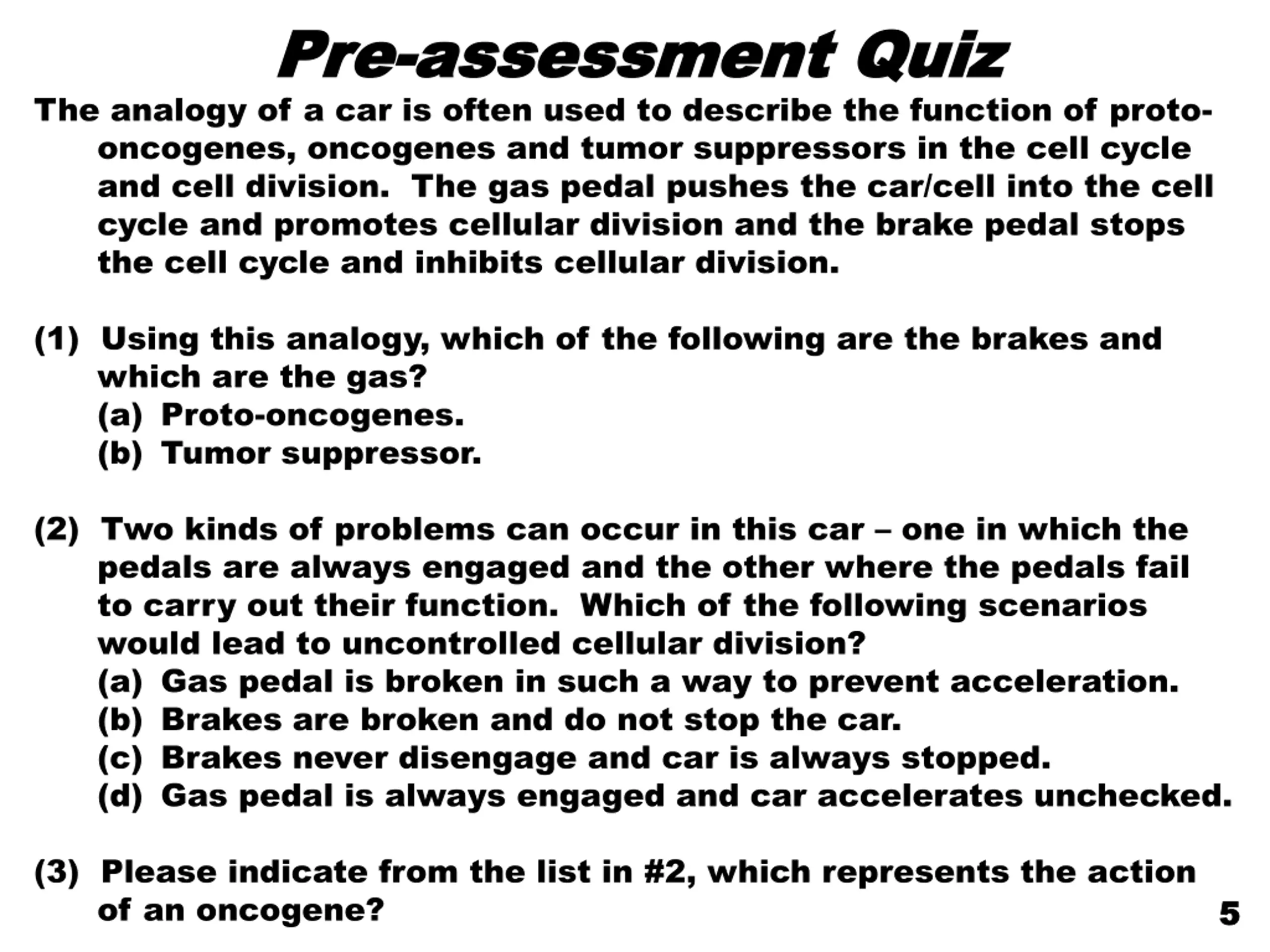 Pre Pre- -assessment Quiz assessment Quiz The analogy of a car is often used to describe the function of proto- oncogenes, oncogenes and tumor suppressors in the cell cycle and cell division. The gas pedal pushes the car/cell into the cell cycle and promotes cellular division and the brake pedal stops the cell cycle and inhibits cellular division. (1) Using this analogy, which of the following are the brakes and which are the gas? (a) Proto-oncogenes. (b) Tumor suppressor. (2) Two kinds of problems can occur in this car one in which the pedals are always engaged and the other where the pedals fail to carry out their function. Which of the following scenarios would lead to uncontrolled cellular division? (a) Gas pedal is broken in such a way to prevent acceleration. (b) Brakes are broken and do not stop the car. (c) Brakes never disengage and car is always stopped. (d) Gas pedal is always engaged and car accelerates unchecked. (3) Please indicate from the list in #2, which represents the action of an oncogene? 5 5