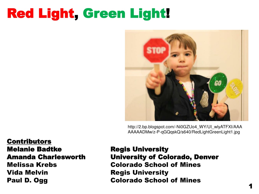 Red Light Red Light, , Green Light Green Light! ! http://2.bp.blogspot.com/-Ni0GZUo4_WY/UI_wlyATFXI/AAA AAAAADMw/z-P-qGQqskQ/s640/RedLightGreenLight1.jpg Contributors Contributors Melanie Badtke Melanie Badtke Amanda Charlesworth Amanda Charlesworth Melissa Krebs Vida Melvin Paul D. Ogg Regis University Regis University University of Colorado, Denver University of Colorado, Denver Colorado School of Mines Regis University Colorado School of Mines 1 1