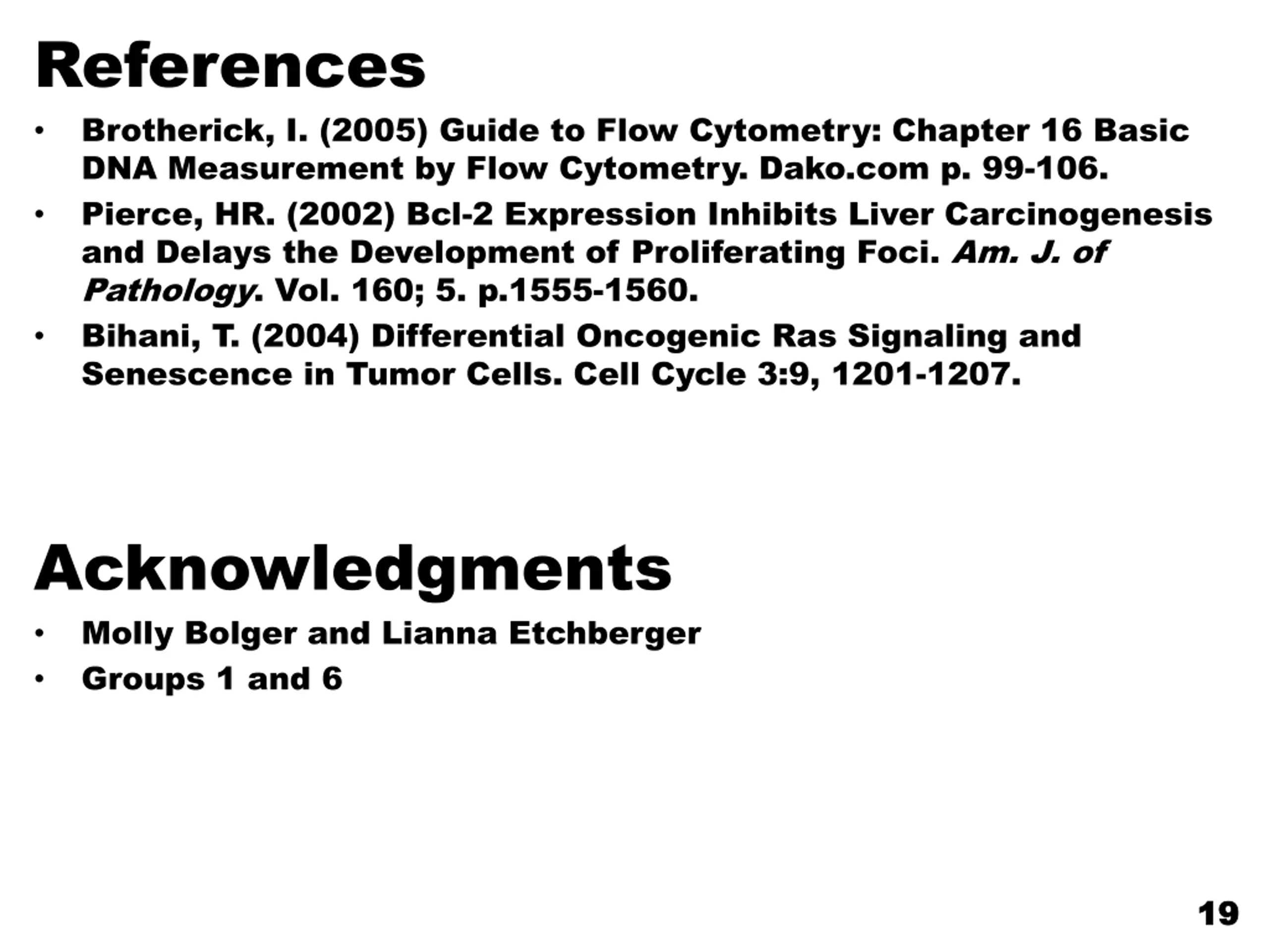References Brotherick, I. (2005) Guide to Flow Cytometry: Chapter 16 Basic DNA Measurement by Flow Cytometry. Dako.com p. 99-106. Pierce, HR. (2002) Bcl-2 Expression Inhibits Liver Carcinogenesis and Delays the Development of Proliferating Foci. Am. J. of Pathology. Vol. 160; 5. p.1555-1560. Bihani, T. (2004) Differential Oncogenic Ras Signaling and Senescence in Tumor Cells. Cell Cycle 3:9, 1201-1207. Acknowledgments Molly Bolger and Lianna Etchberger Groups 1 and 6 19 19