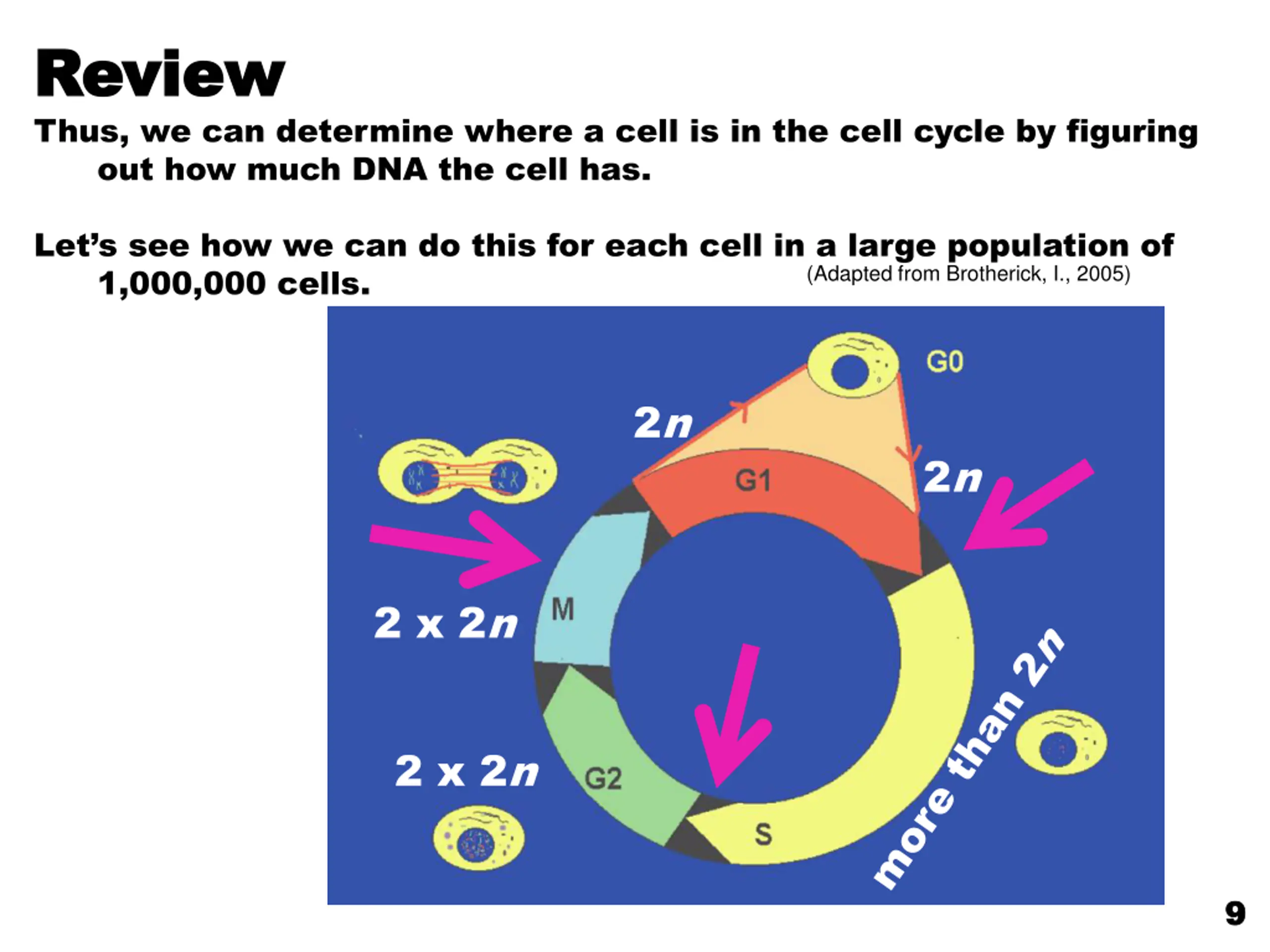 Review Review Thus, we can determine where a cell is in the cell cycle by figuring out how much DNA the cell has. Let s see how we can do this for each cell in a large population of 1,000,000 cells. (Adapted from Brotherick, I., 2005) 2n 2n 2 x 2n 2 x 2n 9 9