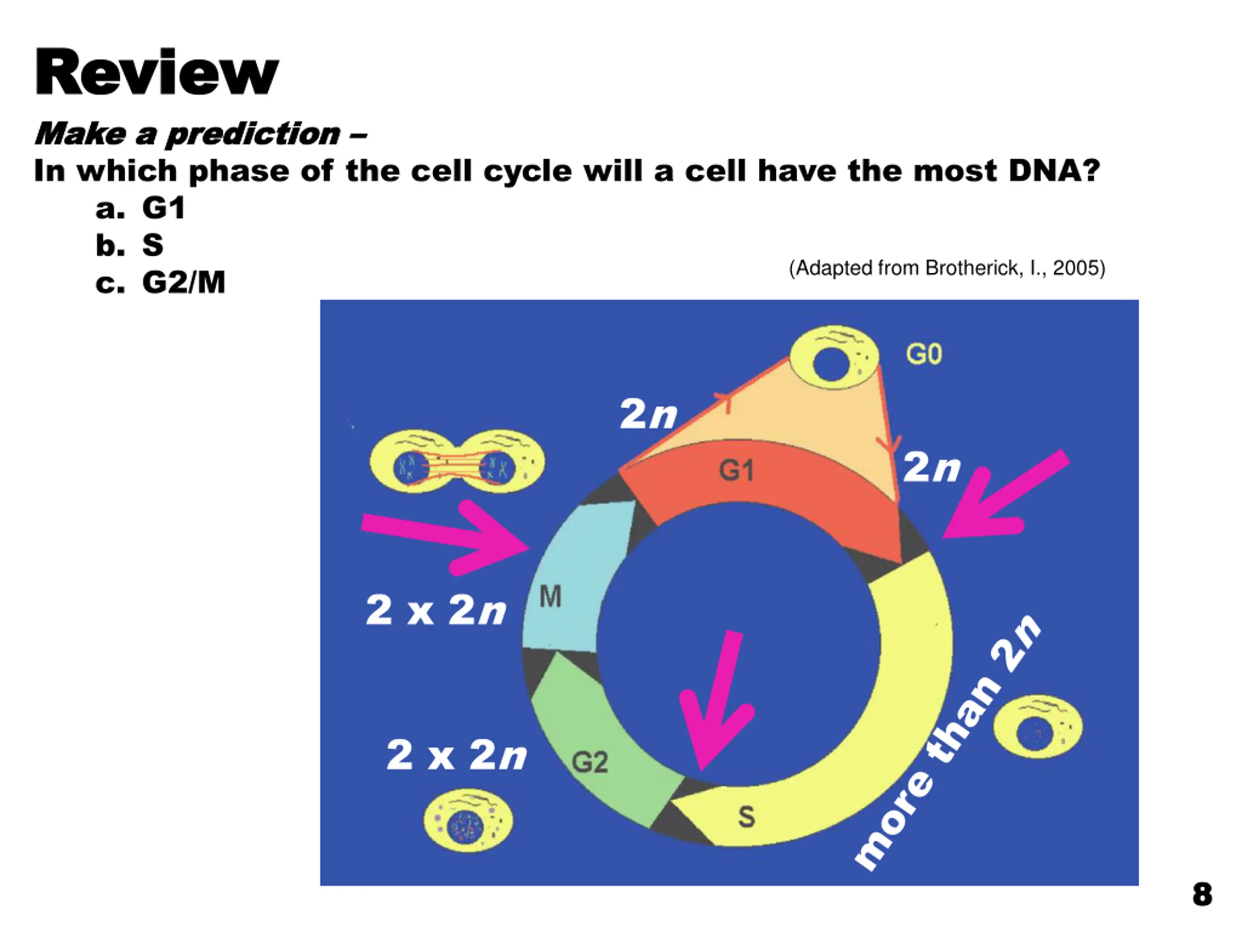 Review Review Make a prediction Make a prediction In which phase of the cell cycle will a cell have the most DNA? a. G1 b. S c. G2/M (Adapted from Brotherick, I., 2005) 2n 2n 2 x 2n 2 x 2n 8 8