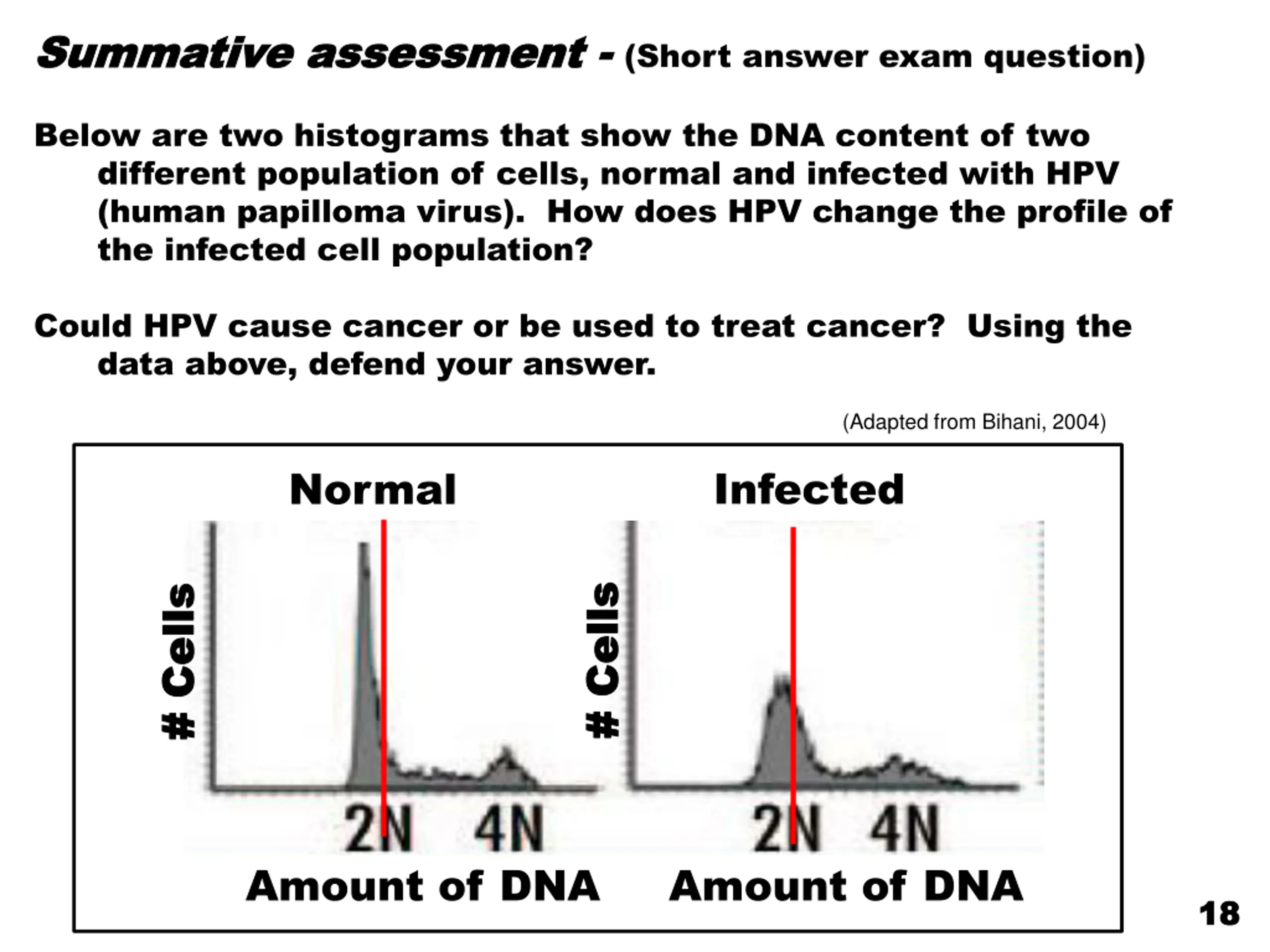 Summative assessment Summative assessment - - (Short answer exam question) Below are two histograms that show the DNA content of two different population of cells, normal and infected with HPV (human papilloma virus). How does HPV change the profile of the infected cell population? Could HPV cause cancer or be used to treat cancer? Using the data above, defend your answer. (Adapted from Bihani, 2004) Infected Normal # Cells # Cells # Cells # Cells Amount of DNA Amount of DNA 18 18