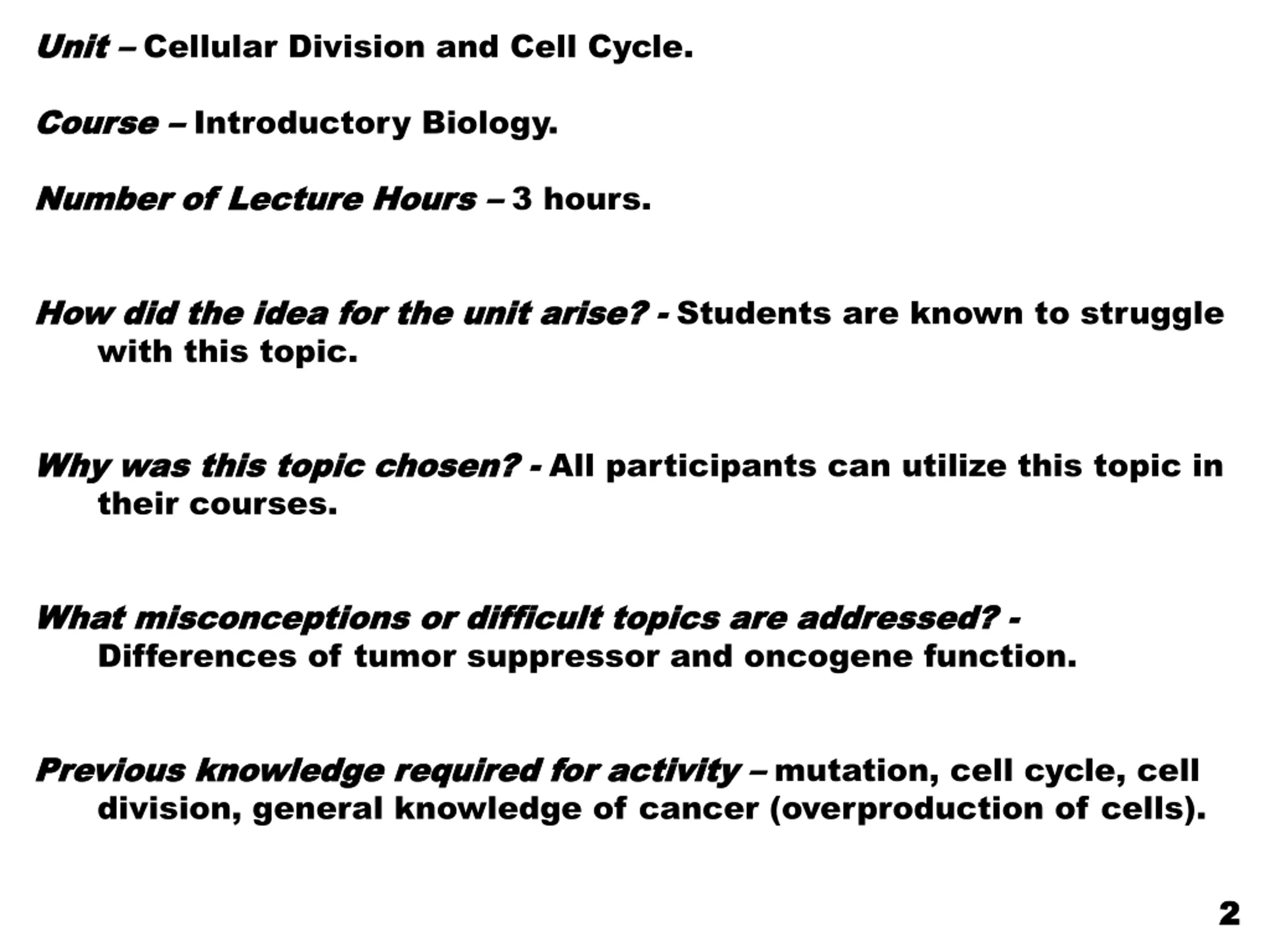Unit Unit Cellular Division and Cell Cycle. Course Course Introductory Biology. Number of Lecture Hours Number of Lecture Hours 3 hours. How did the idea for the unit arise? How did the idea for the unit arise? - - Students are known to struggle with this topic. Why was this topic chosen? Why was this topic chosen? - - All participants can utilize this topic in their courses. What misconceptions or difficult topics are addressed? What misconceptions or difficult topics are addressed? - - Differences of tumor suppressor and oncogene function. Previous knowledge required for activity Previous knowledge required for activity mutation, cell cycle, cell division, general knowledge of cancer (overproduction of cells). 2 2